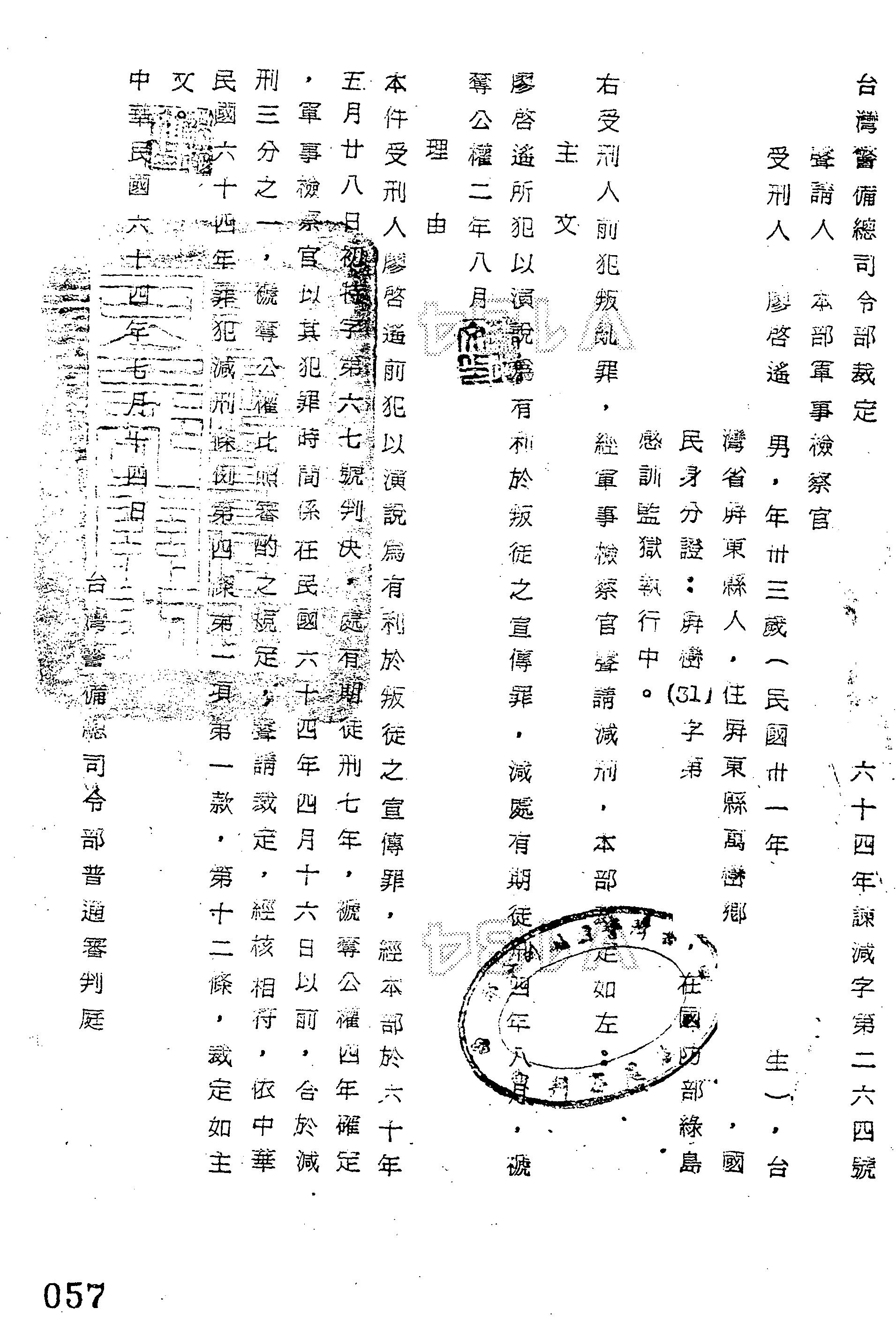 裁判書主文/要旨:廖啟遙所犯「以演說為有利於叛徒之宣傳罪」,減處有期徒刑4年8月,褫奪公權2年8月。