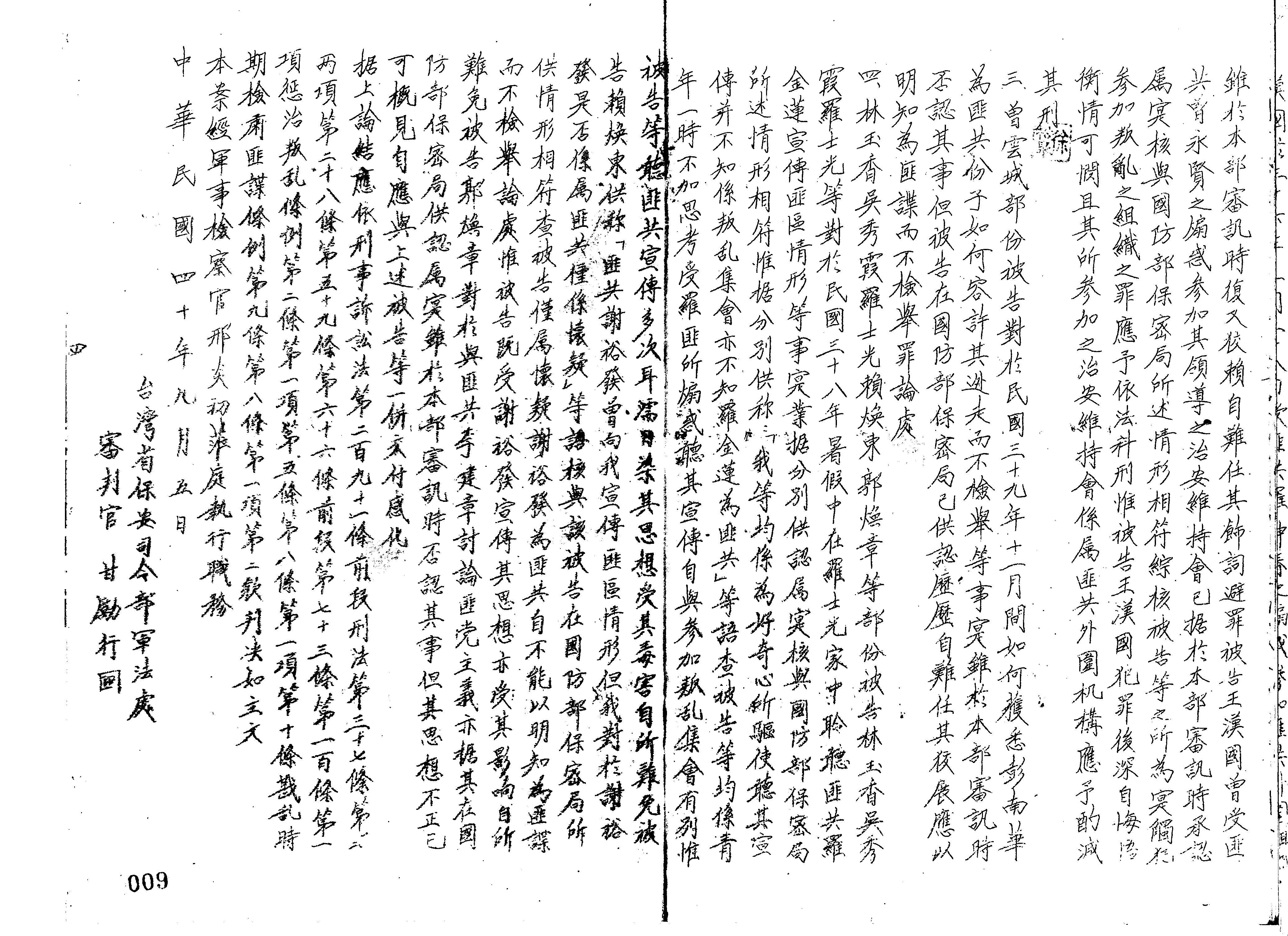 - 法條:刑事訴訟法第291條前段;刑法第37條第1項、第37條第2項、第28條、第59條、第66條前段、第73條、第100條第1項;懲治叛亂條例第2條第1項、第5條、第8條第1項、第10條;戡亂時期檢肅匪諜條例第9條、第8條第1項第2款