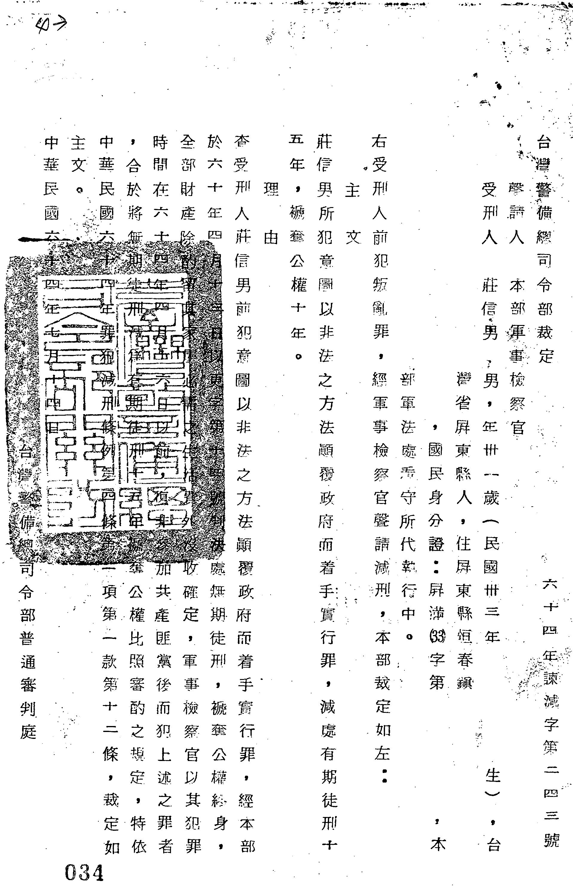 裁判書主文/要旨:莊信男所犯「意圖以非法之方法顛覆政府而著手實行罪」,減處有期徒刑15年,褫奪公權10年。