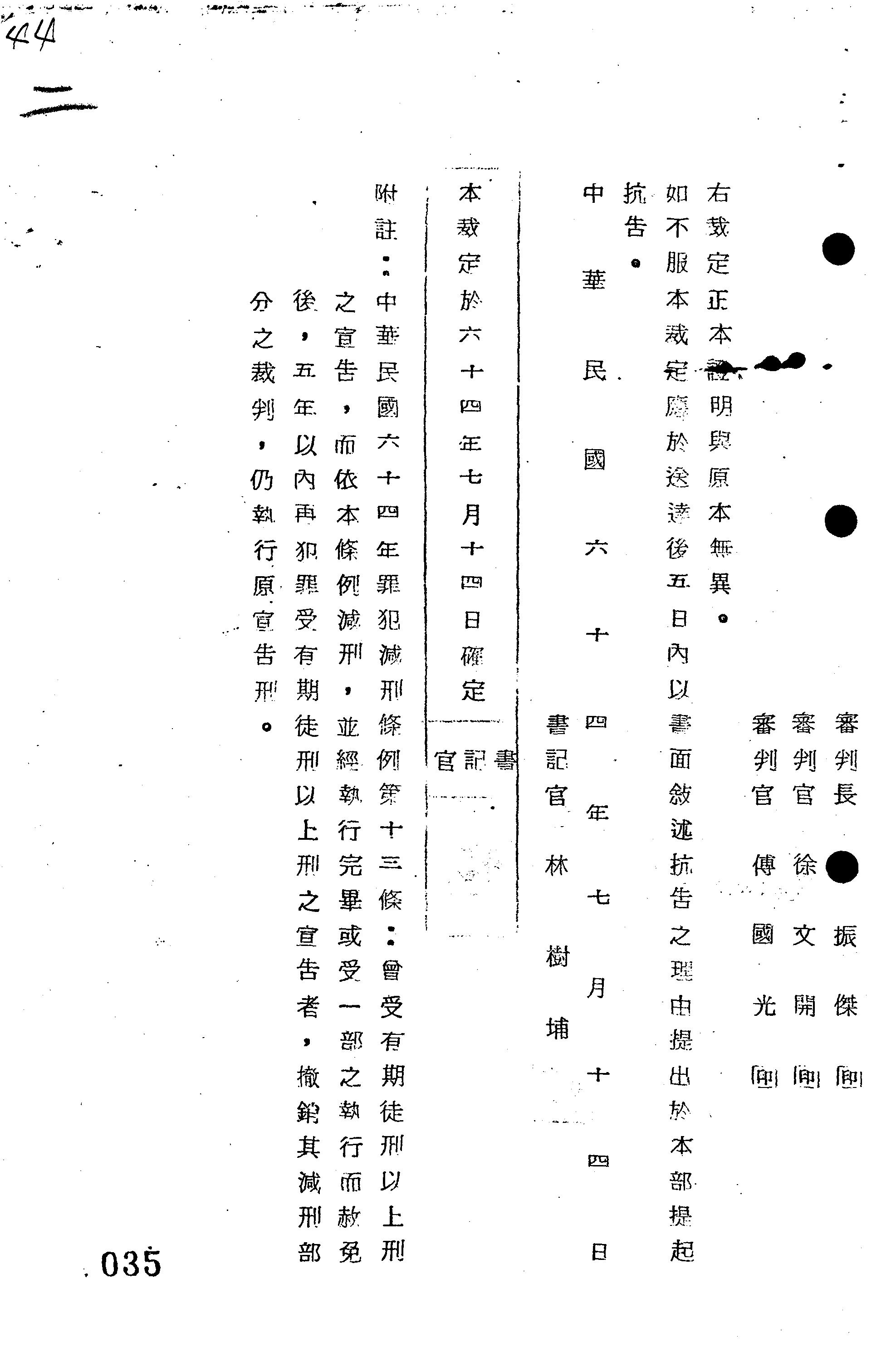臺灣警備總司令部64年諫減字第0243號裁定書