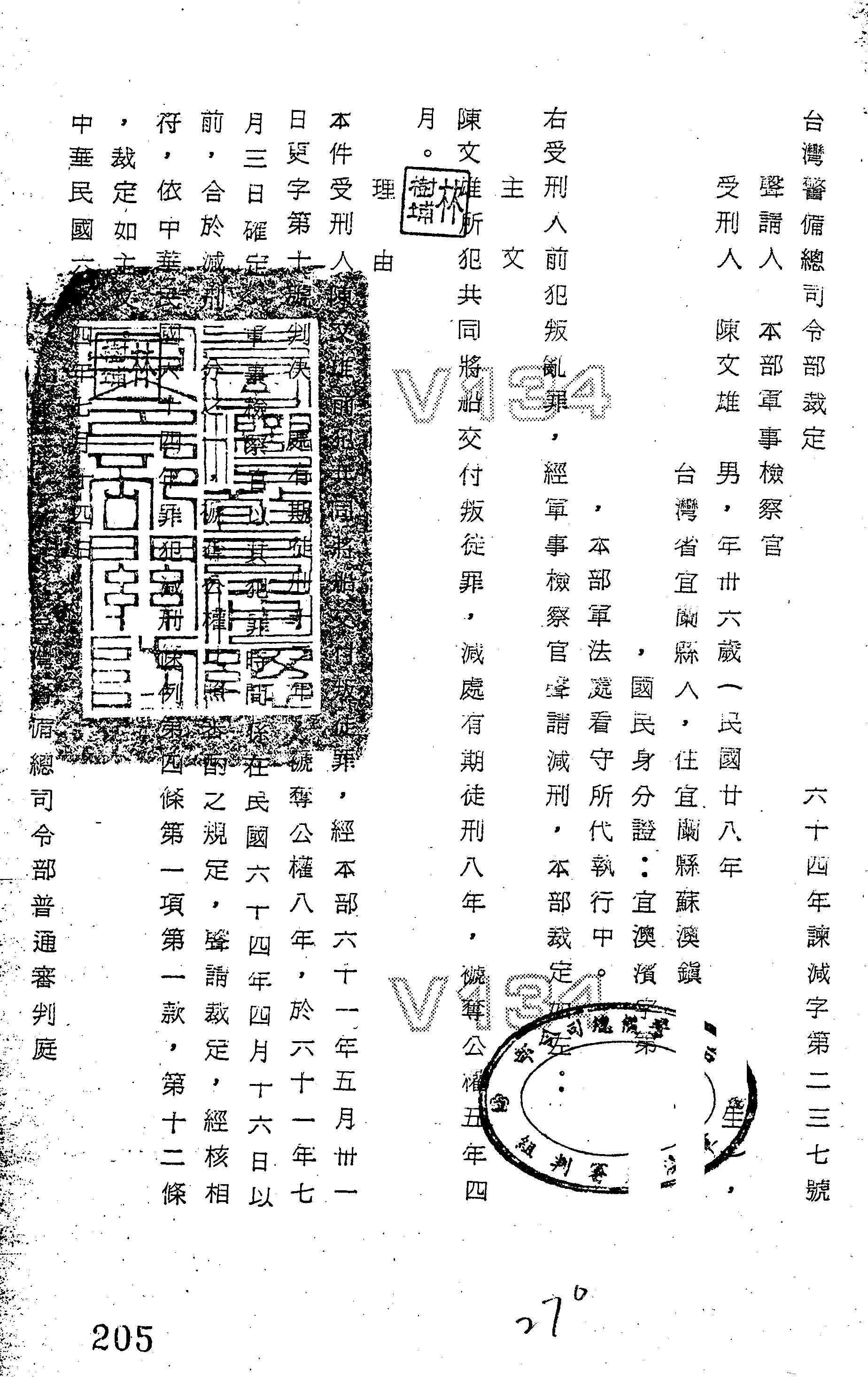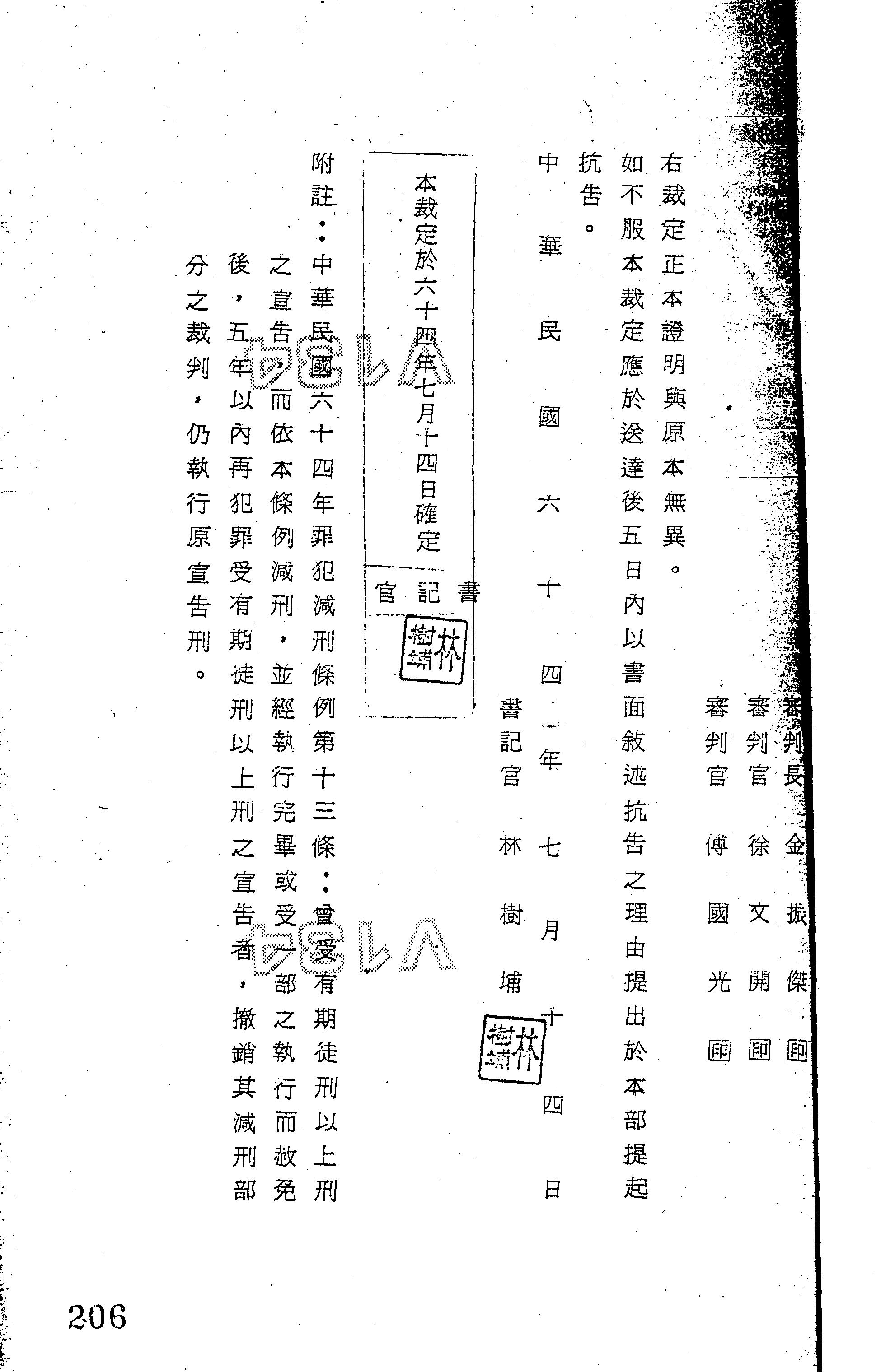 臺灣警備總司令部64年諫減字第0237號裁定書