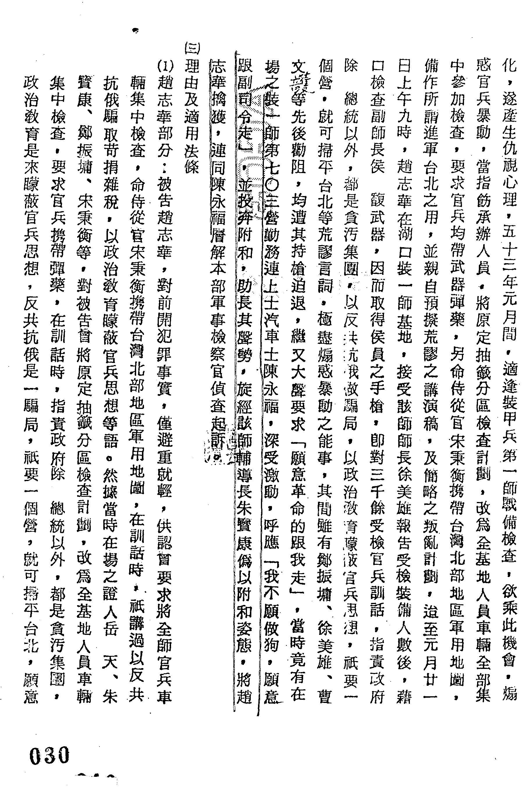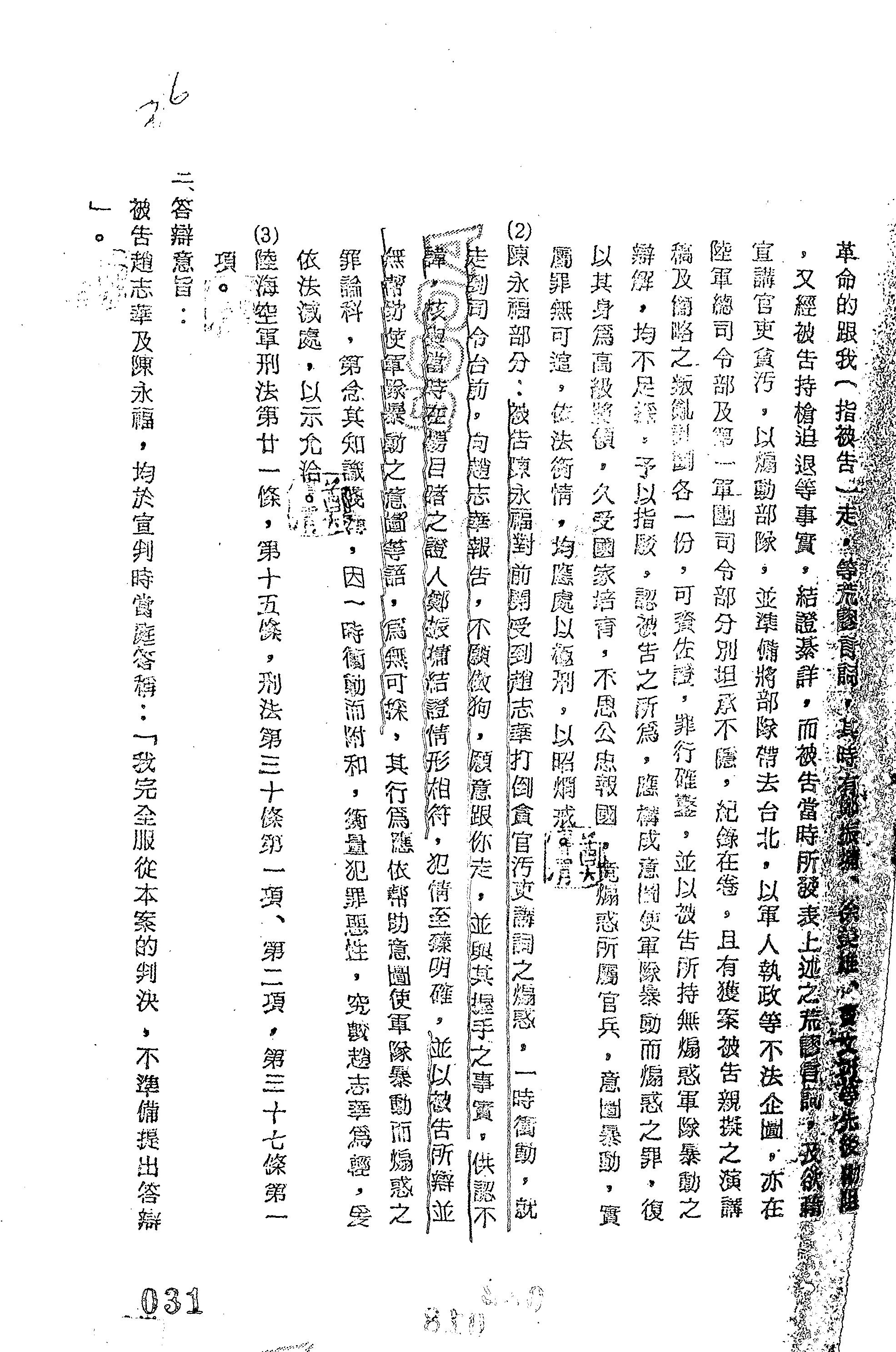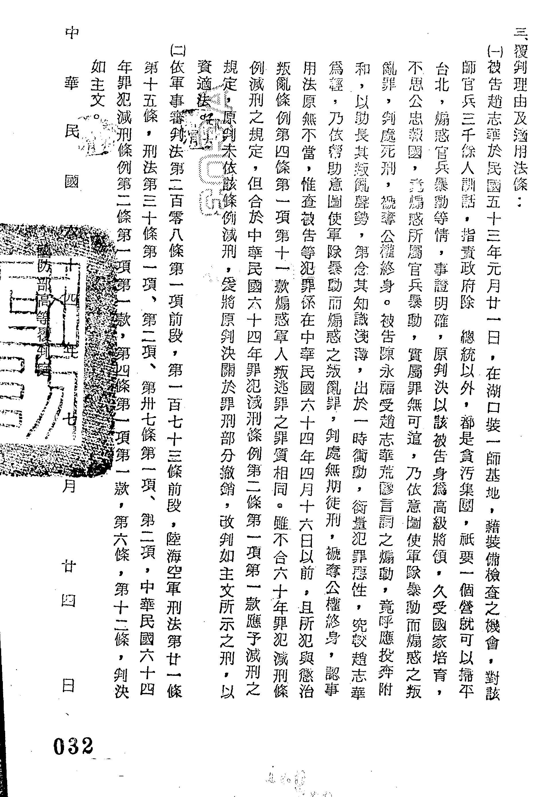 - 裁判書主文/要旨:原判決關於罪刑部分撤銷。趙志華「意圖使軍隊暴動而煽惑之」,處死刑,褫奪公權終身,減處無期徒刑,褫奪公權終身。陳永福「幫助意圖使軍隊暴動而煽惑之」,處無期徒刑,褫奪公權終身,減處有期徒刑15年,褫奪公權10年。