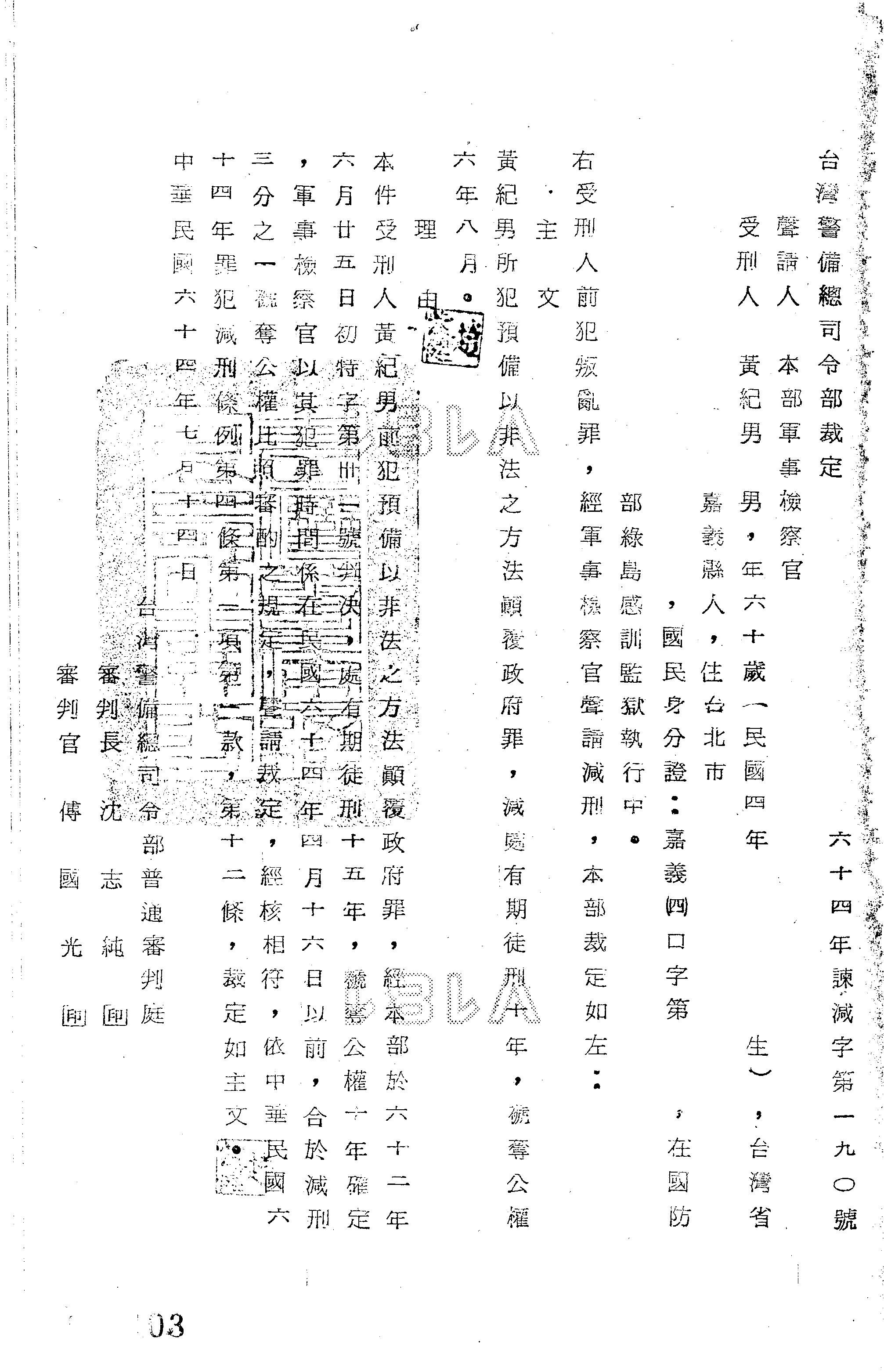 裁判書主文/要旨:黃紀男所犯「預備以非法之方法顛覆政府罪」,減處有期徒刑10年,褫奪公權6年8月。