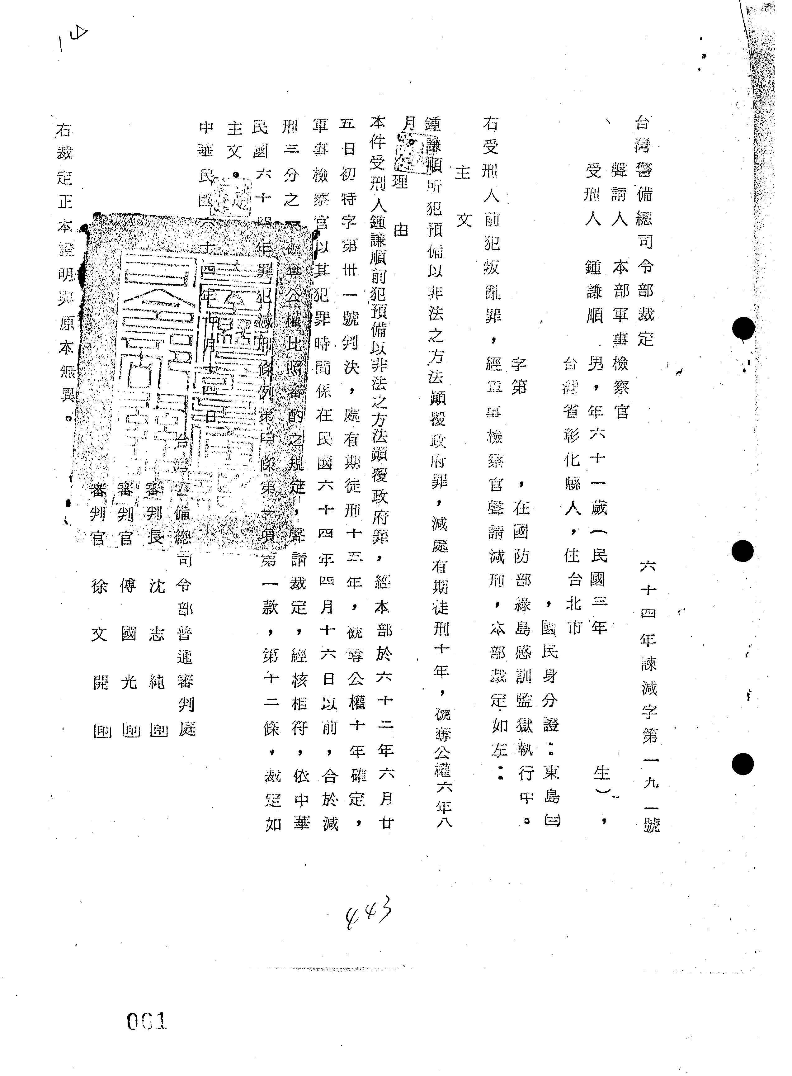 裁判書主文/要旨:鍾謙順所犯「預備以非法之方法顛覆政府罪」,減處有期徒刑10年,褫奪公權6年8月。