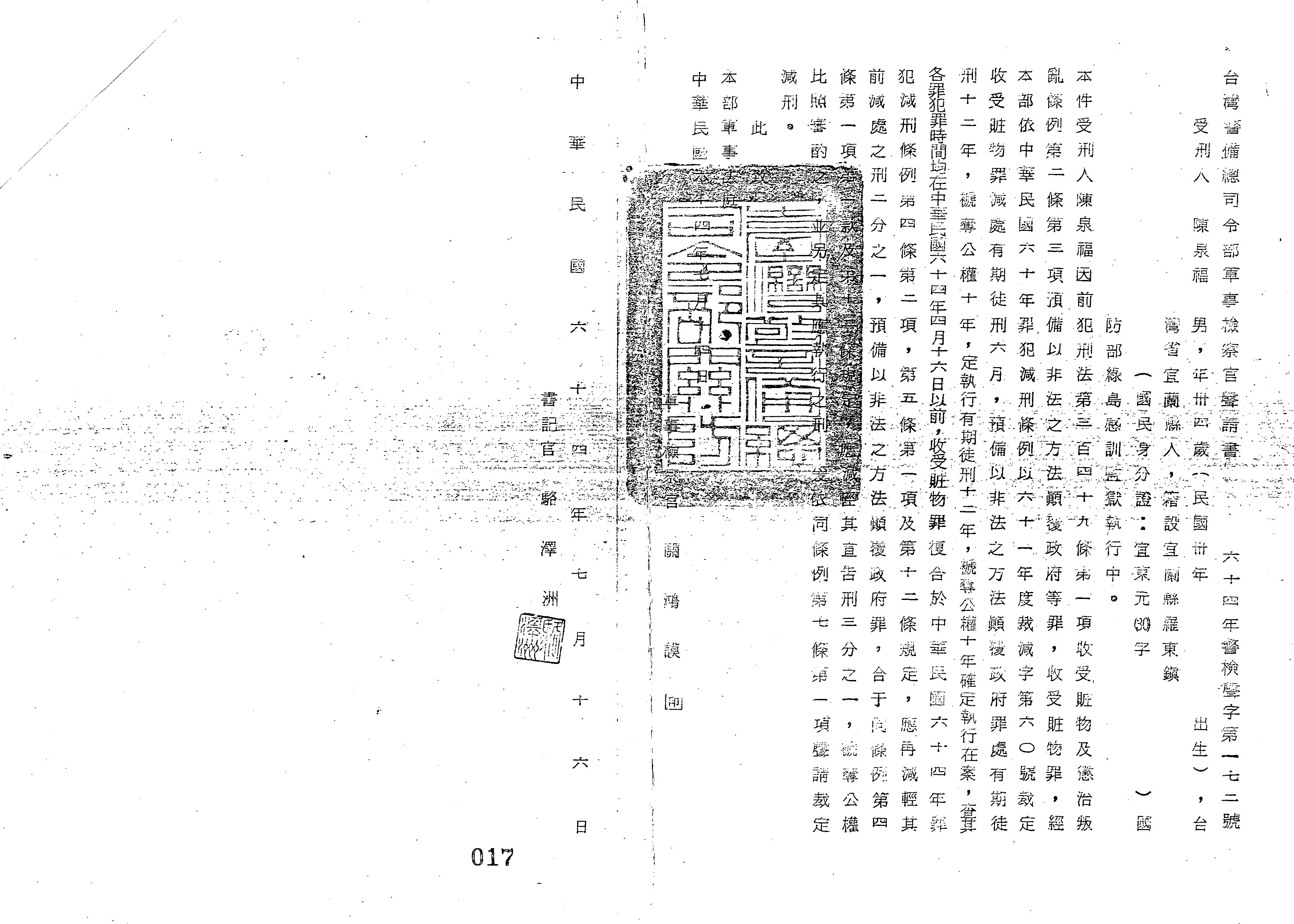 臺灣警備總司令部64年警檢聲字第0172號軍事檢察官聲請書