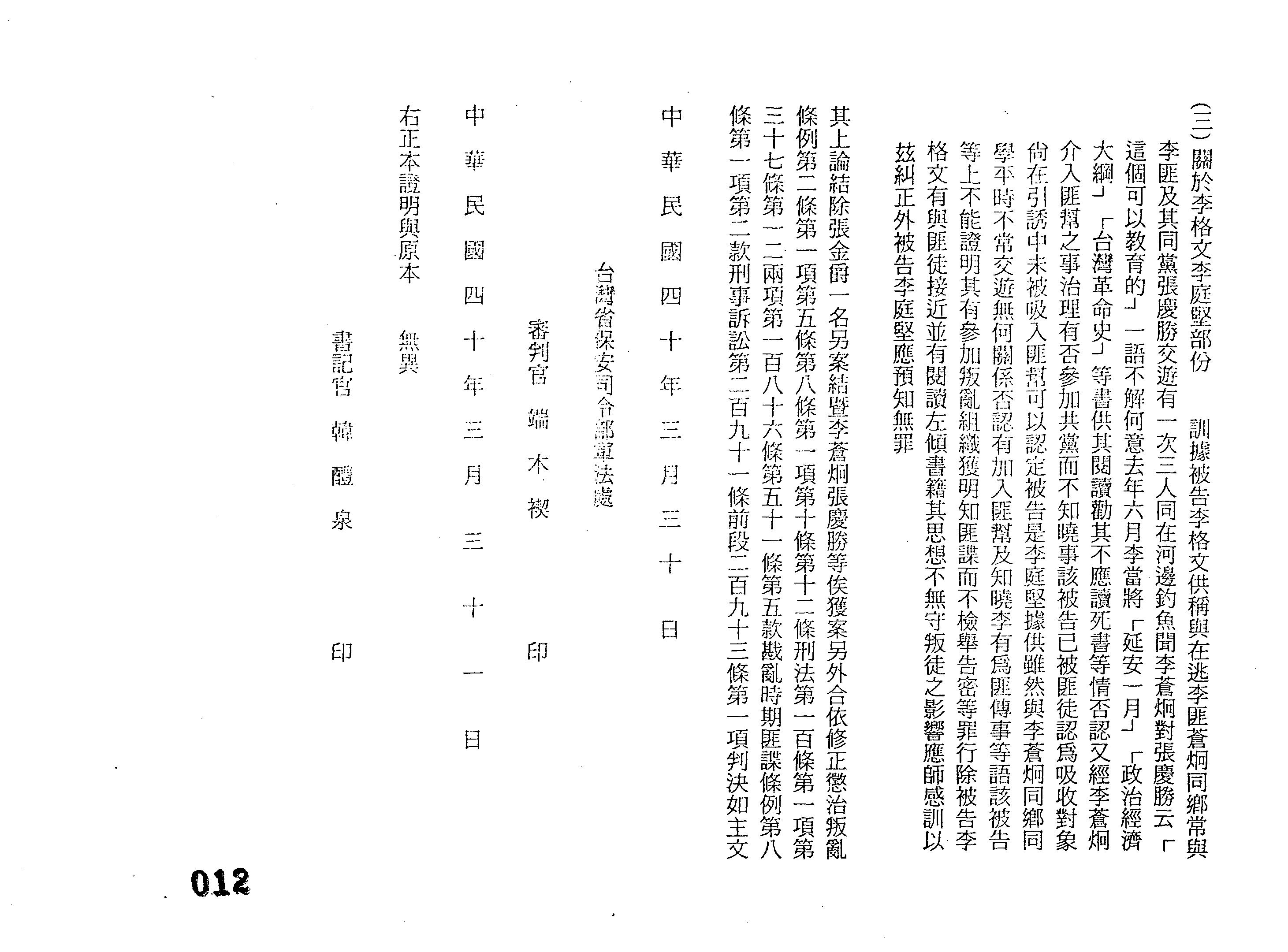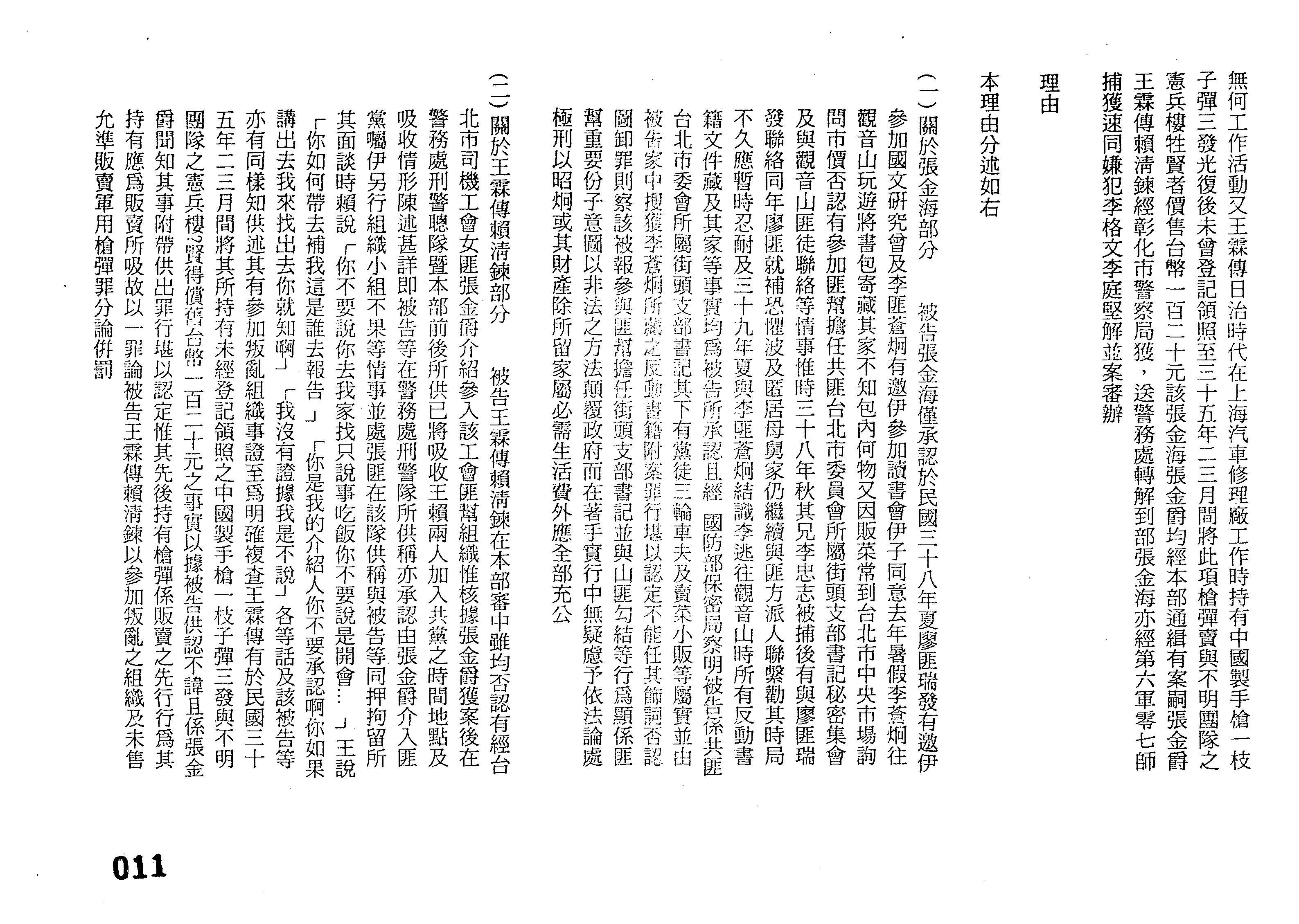 - 法條:修正懲治叛亂條例第2條第1項、第5條、第8條第1項、第10條、第12條;刑法第100條第1項、第37條第1項、第37條第2項、第186條、第51條第5款;戡亂時期檢肅匪諜條例第8條第1項第2款;刑事訴訟法第291條前段、第293條第1項