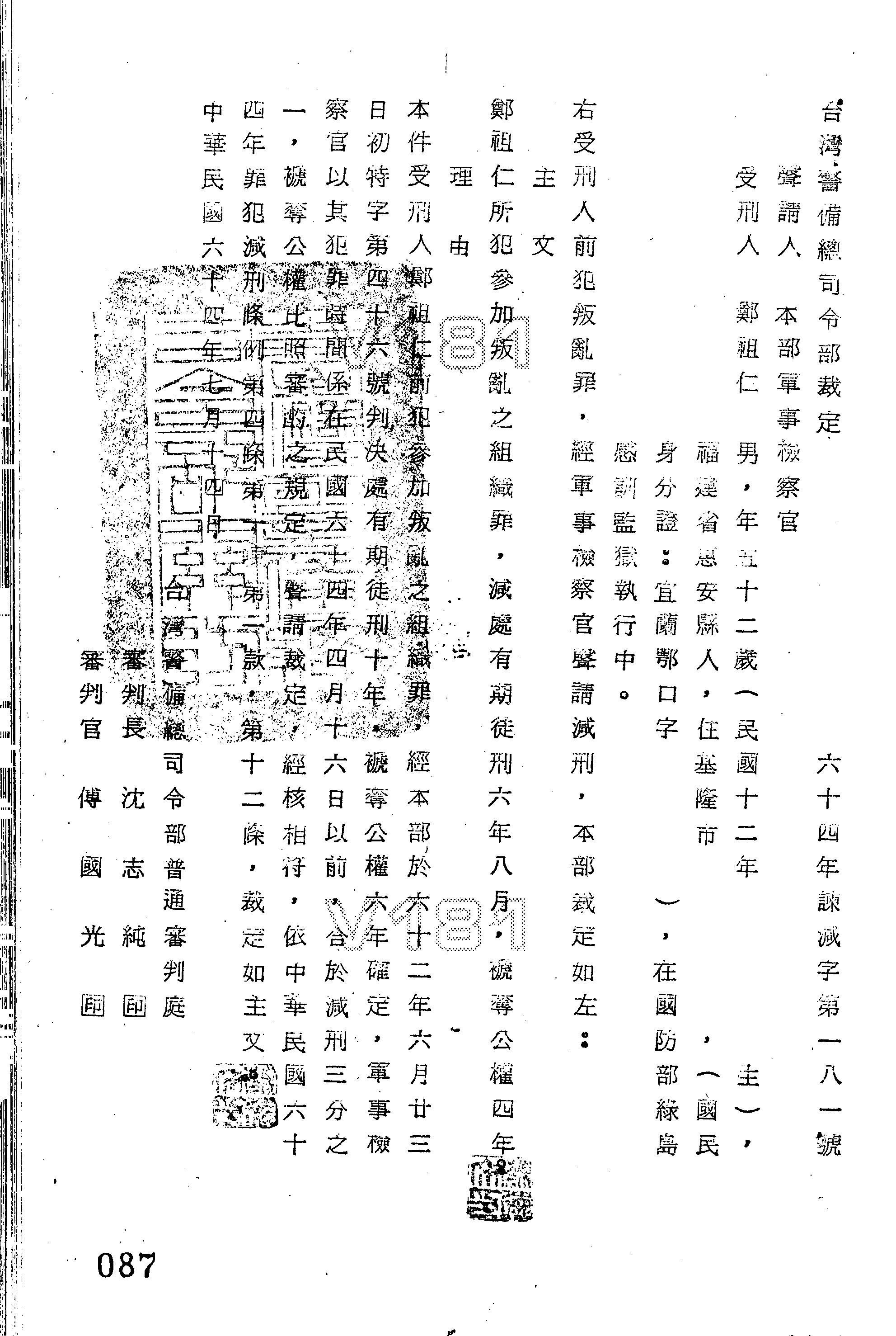 裁判書主文/要旨:鄭祖仁所犯「參加叛亂之組織罪」,減處有期徒刑6年8月,褫奪公權4年。