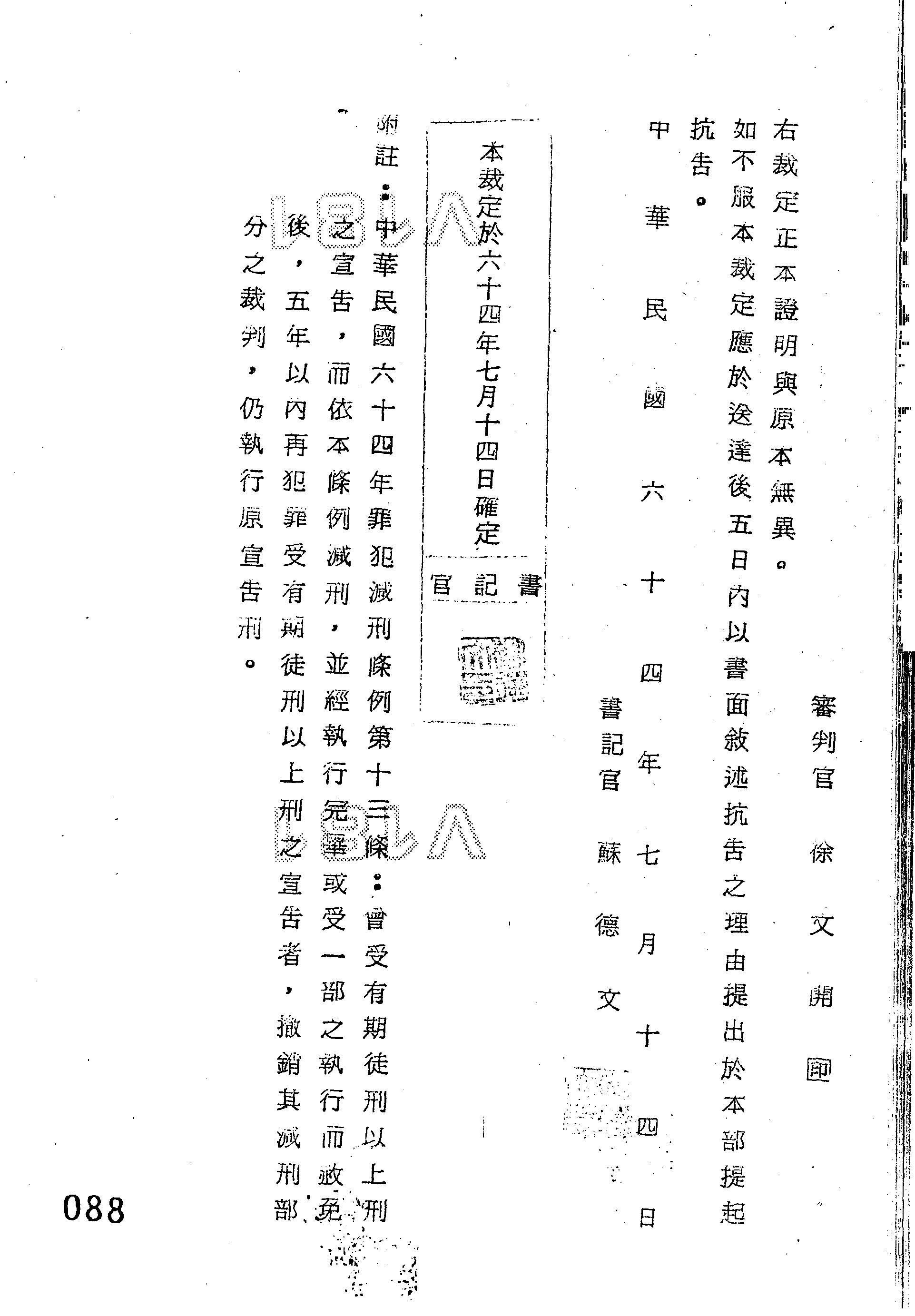 臺灣警備總司令部64年諫減字第0181號裁定書