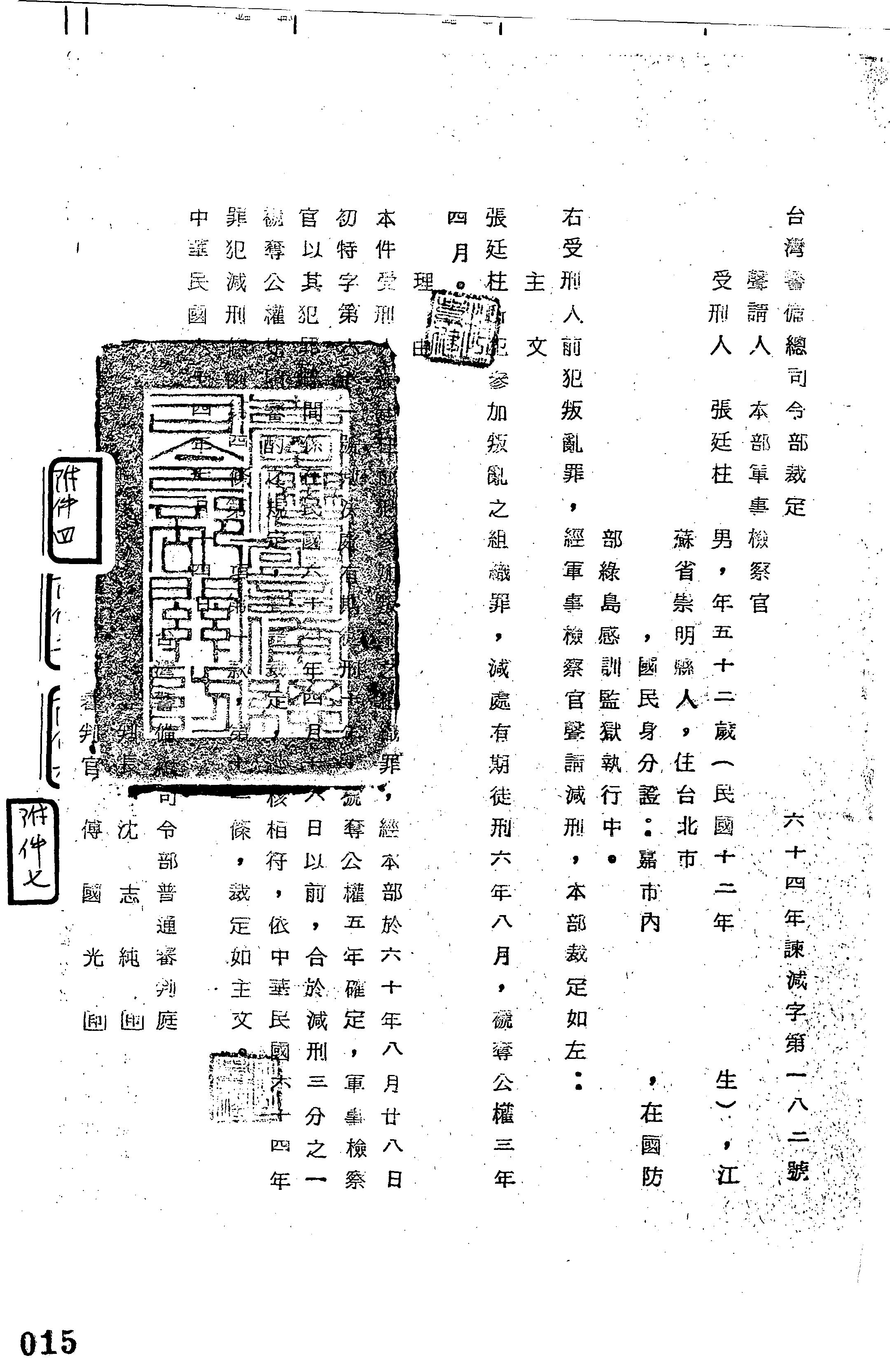 臺灣警備總司令部64年諫減字第0182號裁定書