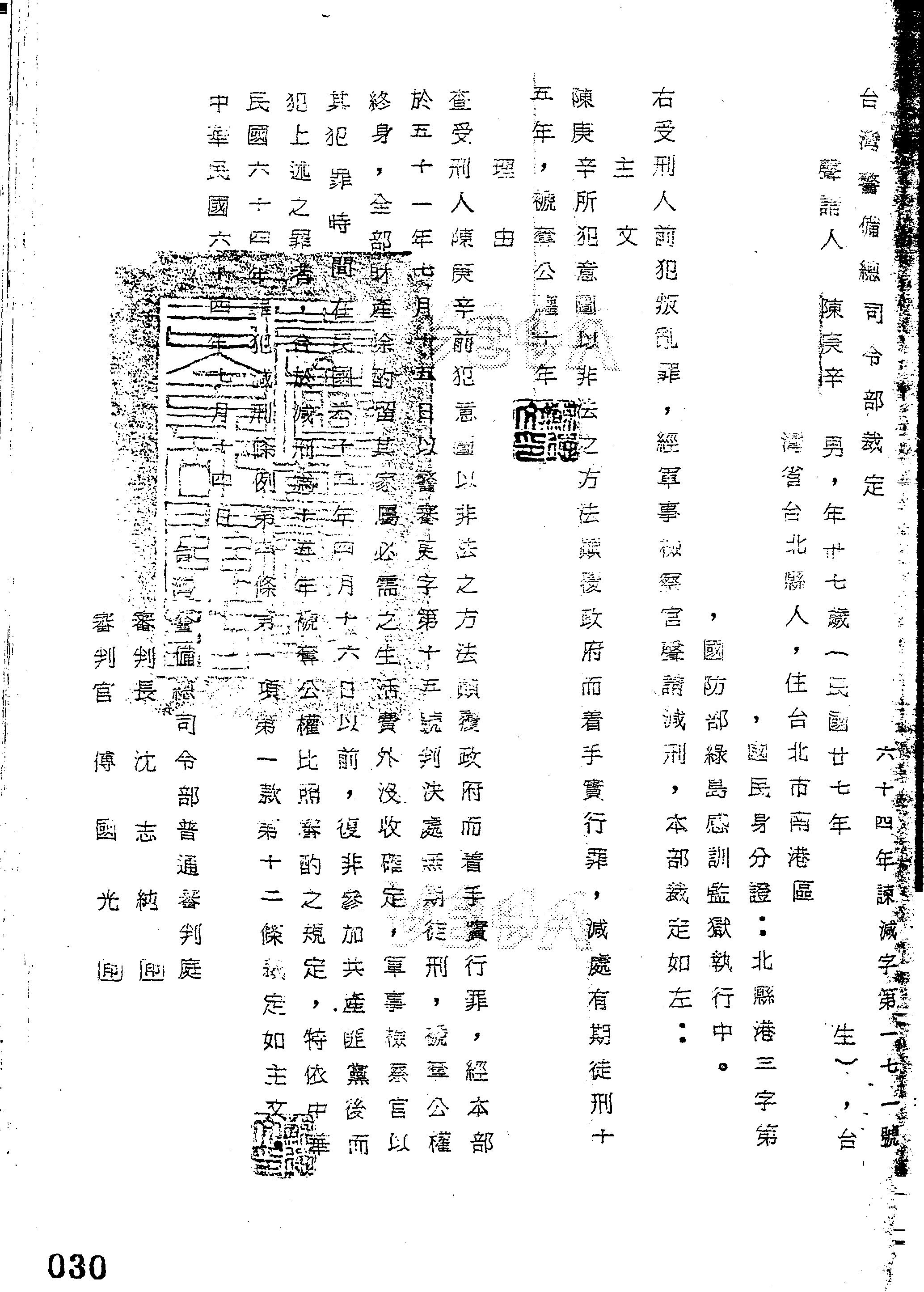 裁判書主文/要旨:陳庚辛所犯「意圖以非法之方法顛覆政府而著手實行罪」,減處有期徒刑15年,褫奪公權10年。