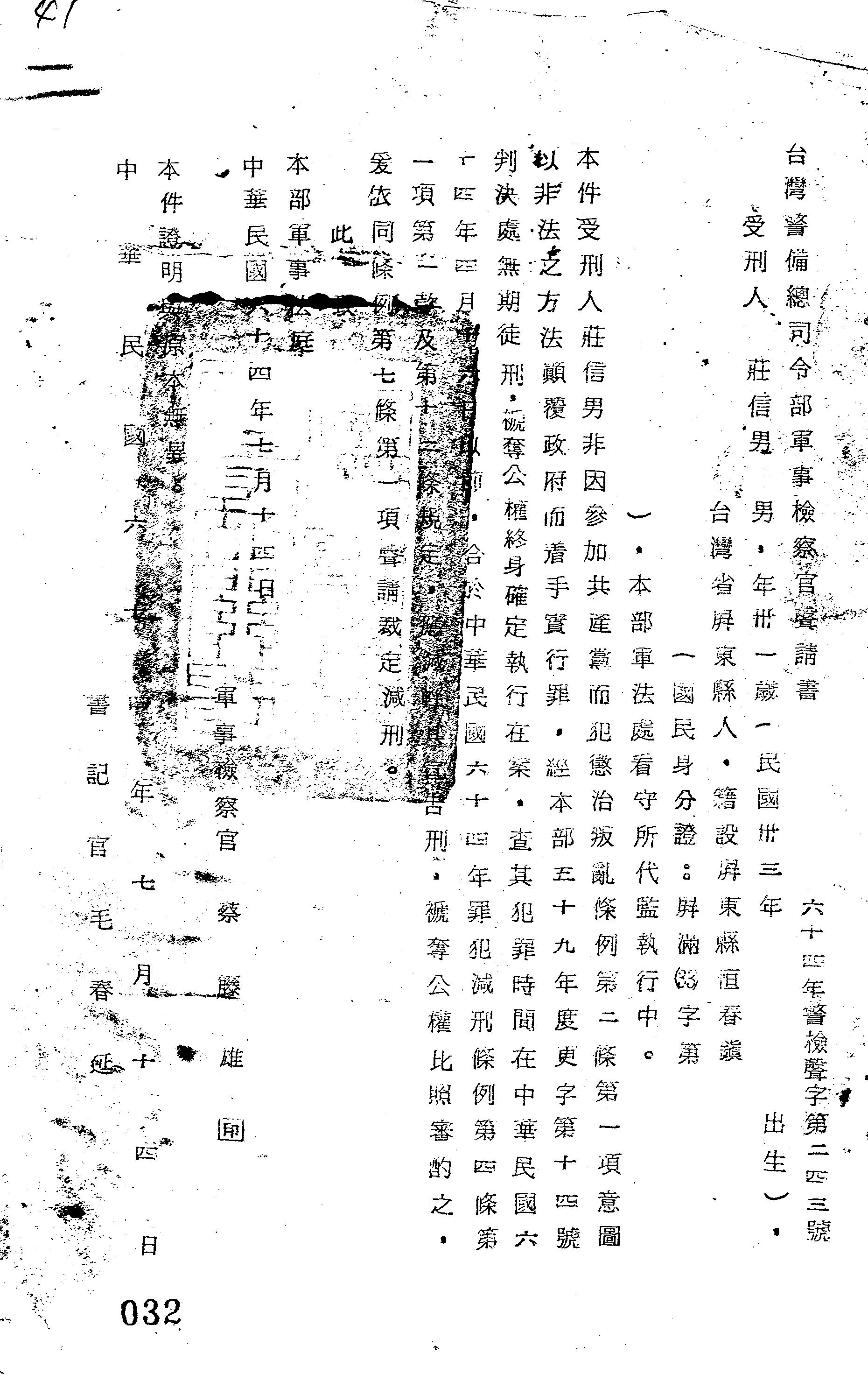 臺灣警備總司令部64年警檢聲字第0243號軍事檢察官聲請書