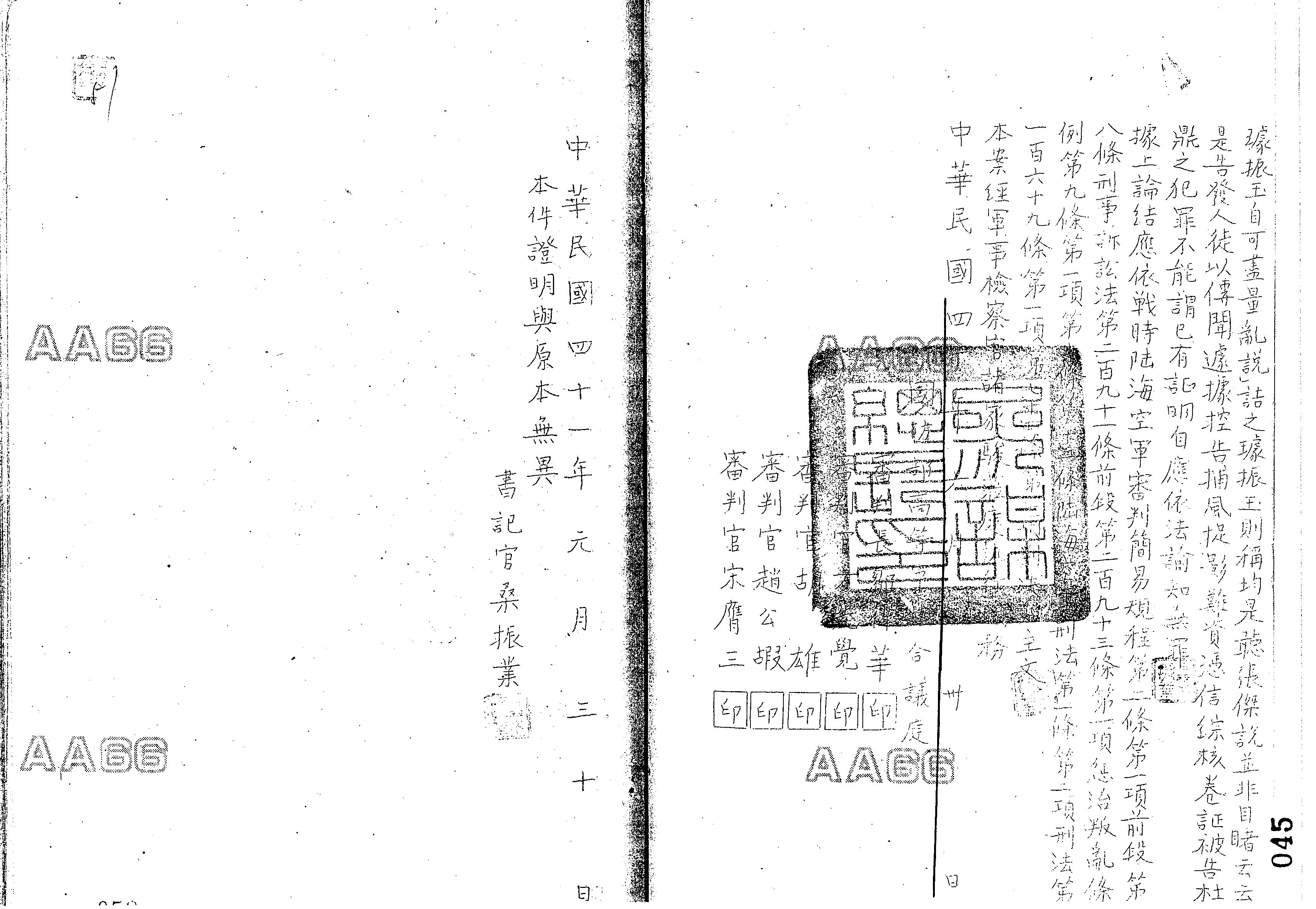- 法條:戰時陸海空軍審判簡易規程第2條第1項前段、第8條;刑事訴訟法第291條前段、第293條第1項;懲治叛亂條例第9條第1項、第10條、第12條;陸海空軍刑法第1條第2項;刑法第169條第1項、第74條第1項