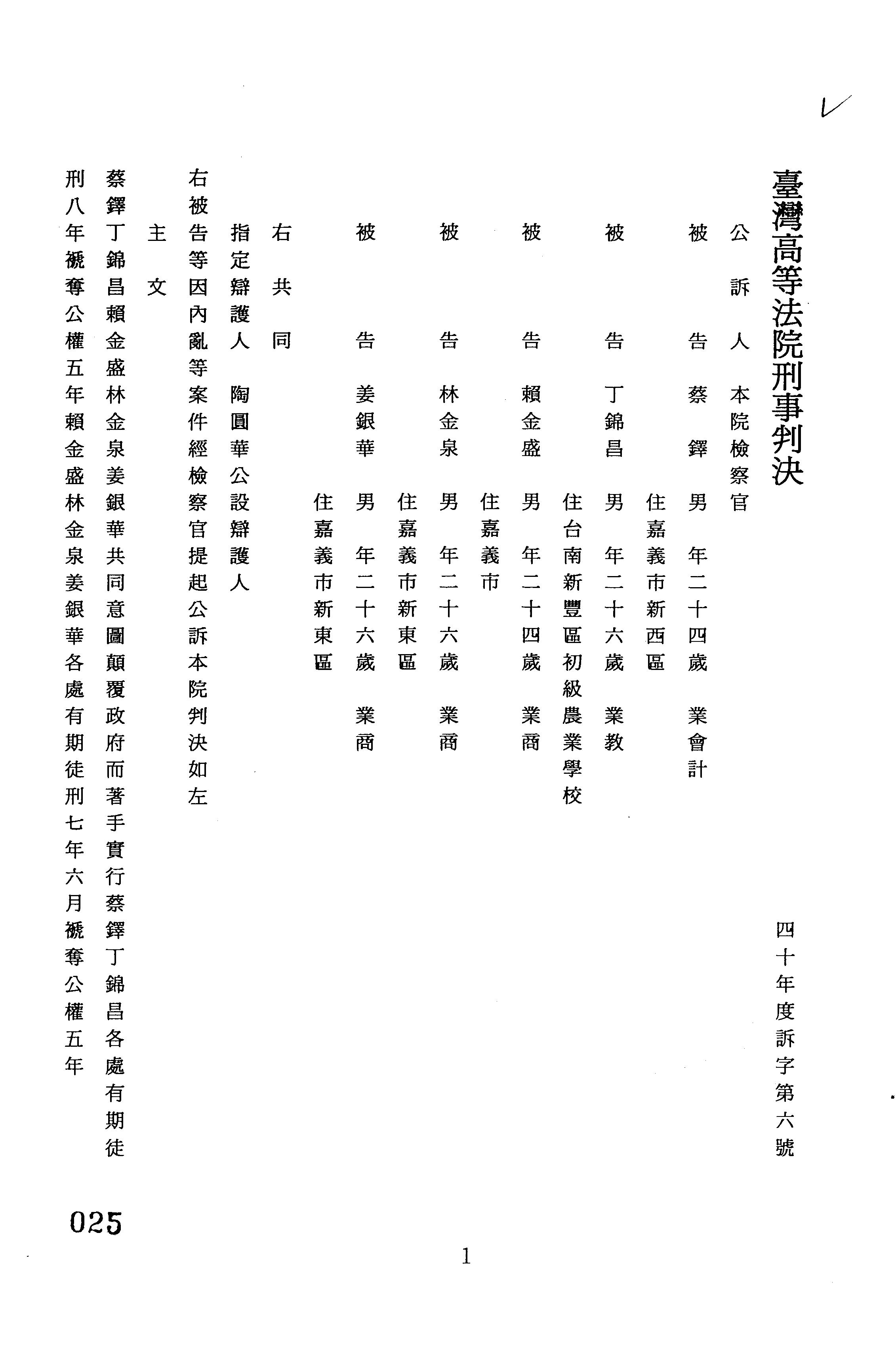- 裁判書正題名: 臺灣高等法院40年訴字第0006號刑事判決書