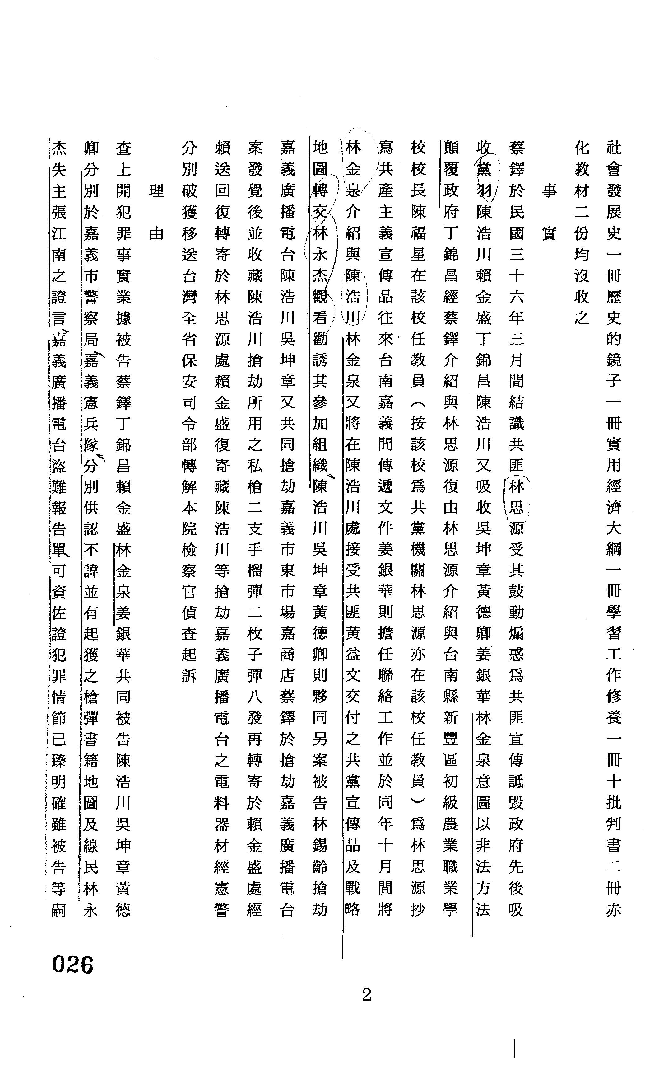 - 裁判書主文/要旨:蔡鐸、丁錦昌、賴金盛、林金泉、姜銀華「共同意圖顛覆政府而著手實行」;蔡鐸、丁錦昌各處有期徒刑8年,褫奪公權5年;賴金盛、林金泉、姜銀華各處有期徒刑7年6月,褫奪公權5年。社會發展史1冊、歷史的鏡子1冊、實用經濟大綱1冊、學習工作修養1冊、十批判書2冊、赤化教材2份均沒收之。