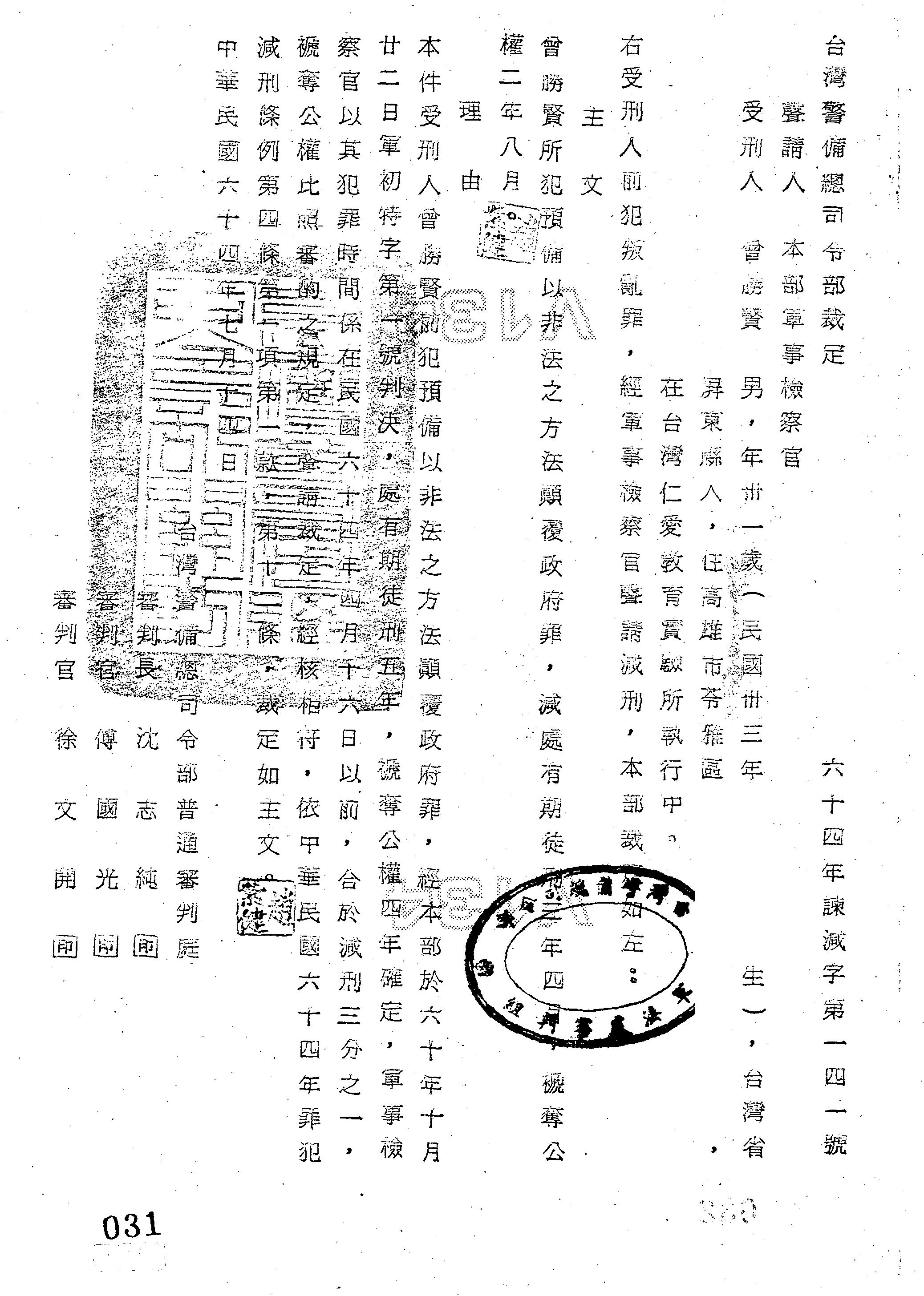 裁判書主文/要旨:曾勝賢所犯「預備以非法之方法顛覆政府罪」,減處有期徒刑3年4月,褫奪公權2年8月。