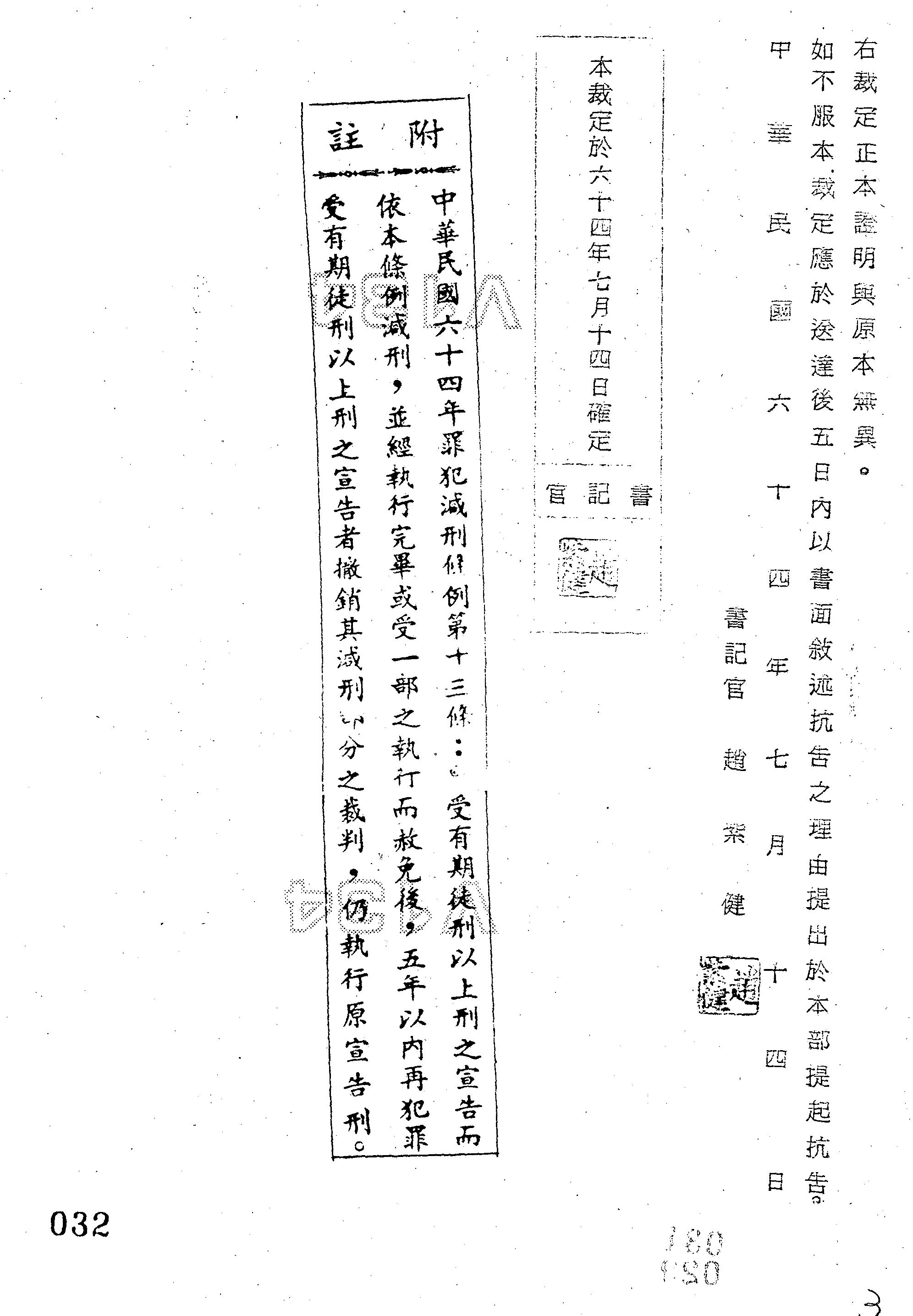 臺灣警備總司令部64年諫減字第0141號裁定書