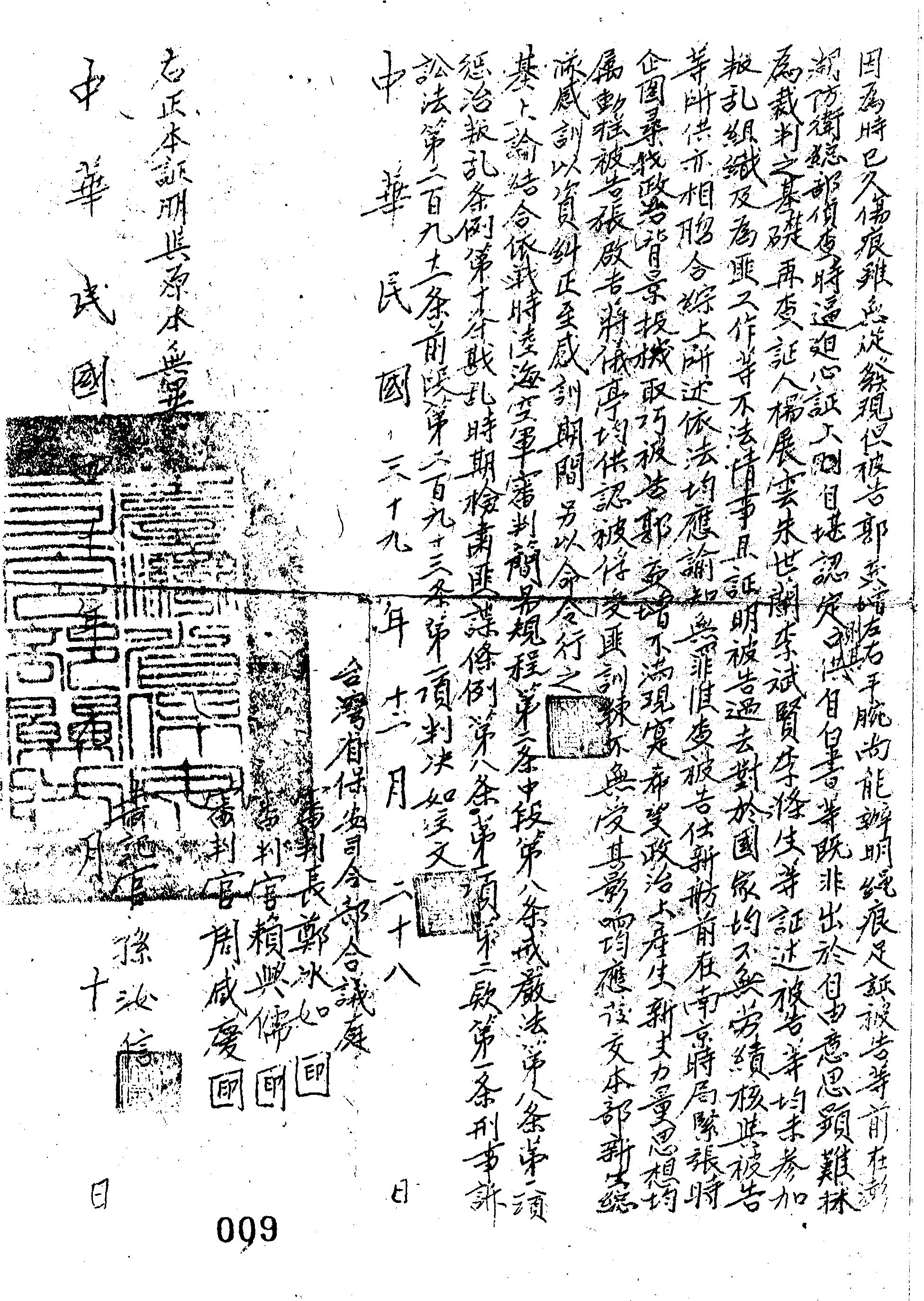 - 法條:戰時陸海空軍審判簡易規程第2條中段、第8條;戒嚴法第8條第2項;懲治叛亂條例第10條;戡亂時期檢肅匪諜條例第8條第1項第2款、第1條;刑事訴訟法第291條前段、第293條第1項