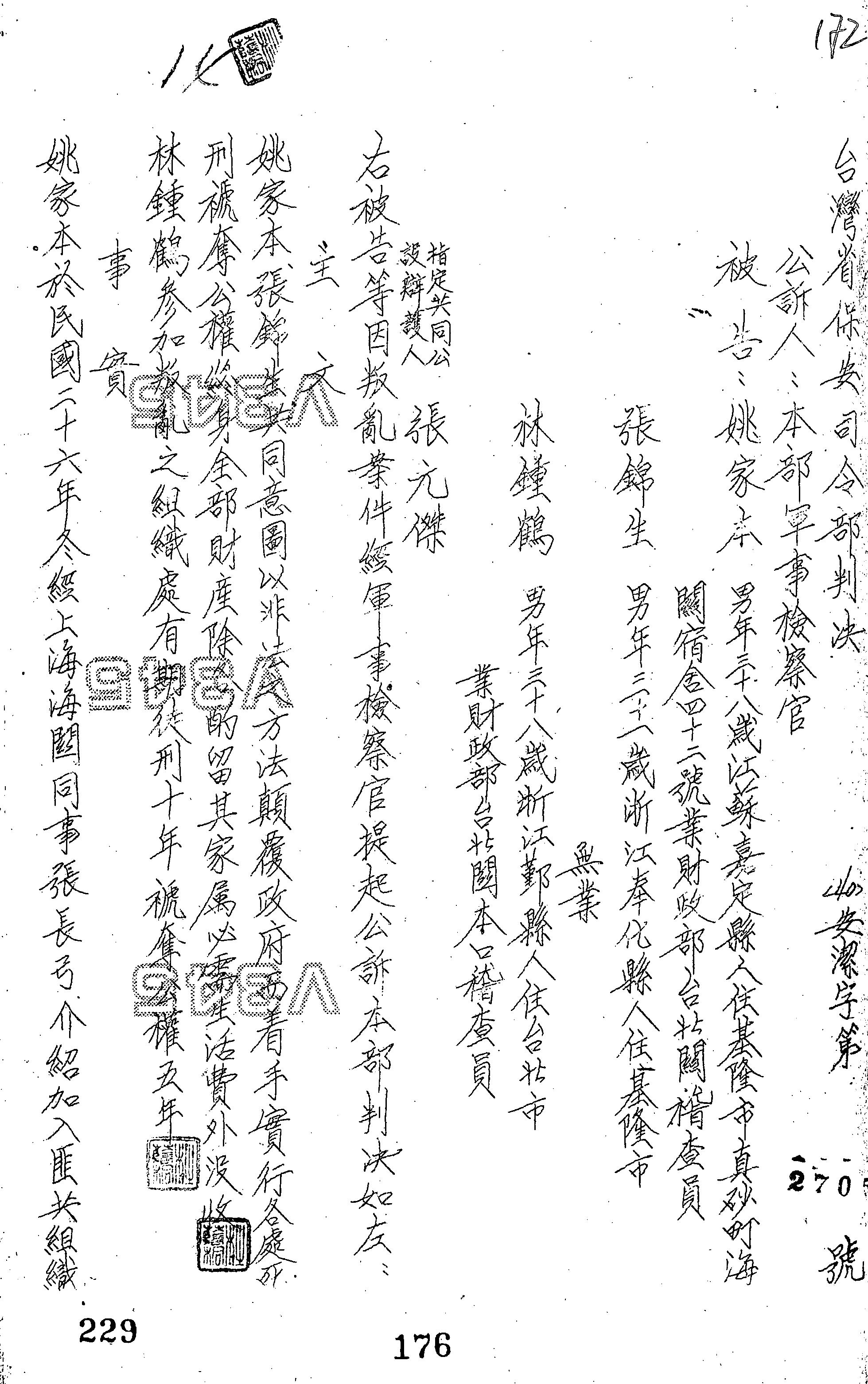 - 裁判書主文/要旨:姚家本、張錦生「共同意圖以非法之方法顛覆政府而著手實行」各處死刑,褫奪公權終身,全部財產除酌留其家屬必需生活費外沒收。林鍾鶴「參加叛亂之組織」處有期徒刑10年,褫奪公權5年。