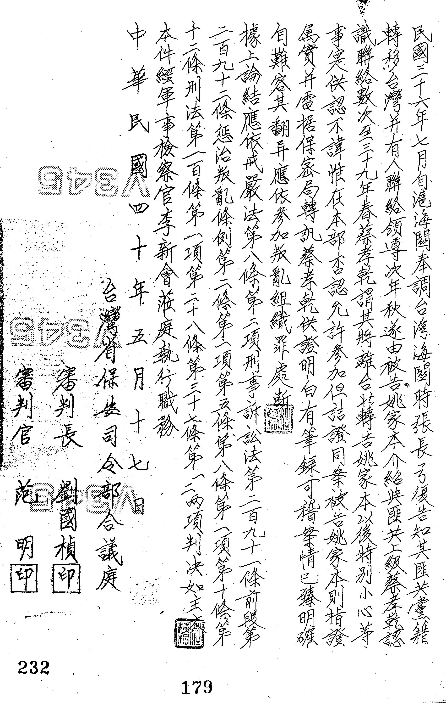 - 法條:戒嚴法第8條第2項;刑事訴訟法第291條前段、第292條;懲治叛亂條例第2條第1項、第5條、第8條第1項、第10條、第12條;刑法第100條第1項、第28條、第37條第1項、第37條第2項