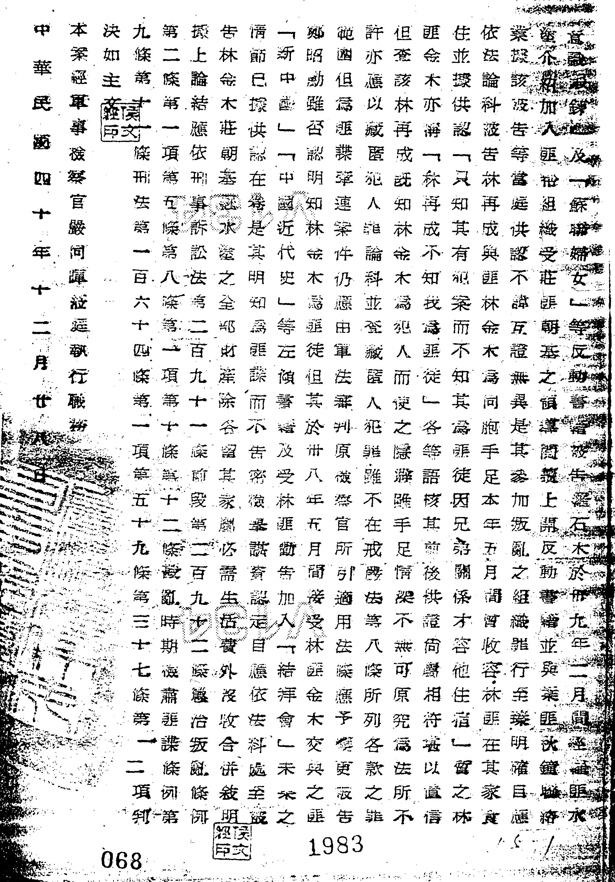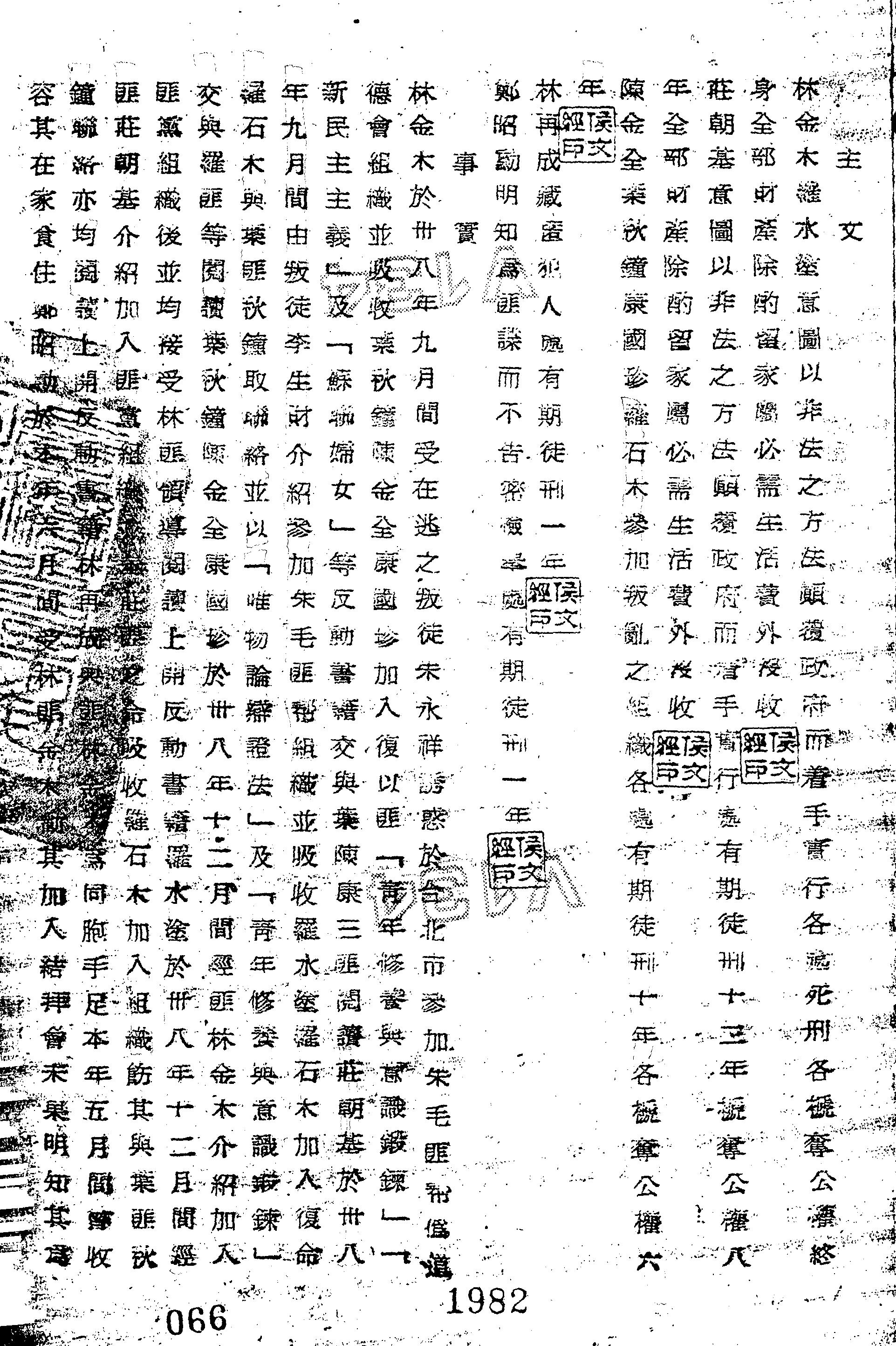 - 法條:刑事訴訟法第291條前段、第292條;懲治叛亂條例第2條第1項、第5條、第8條第1項、第10條、第12條;戡亂時期檢肅匪諜條例第9條、第11條;刑法第164條第1項、第59條、第37條第1項、第37條第2項