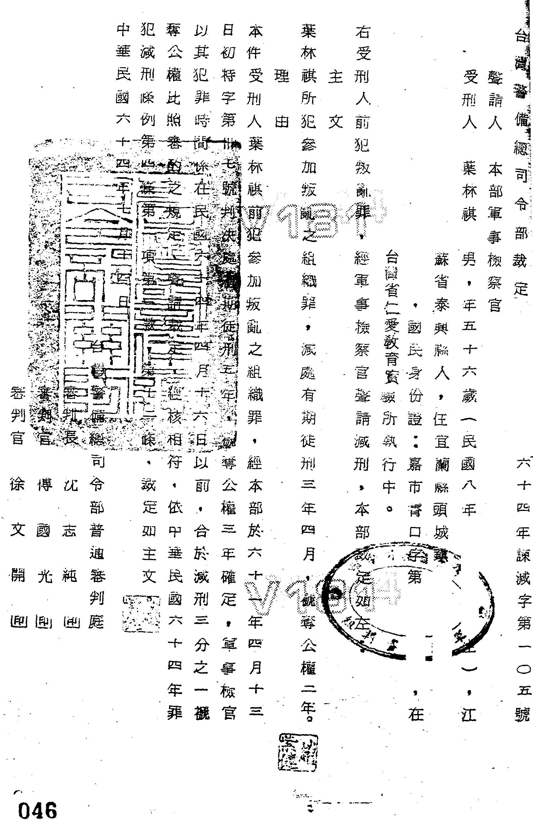 裁判書主文/要旨:葉林祺所犯「參加叛亂之組織罪」,減處有期徒刑3年4月,褫奪公權2年。