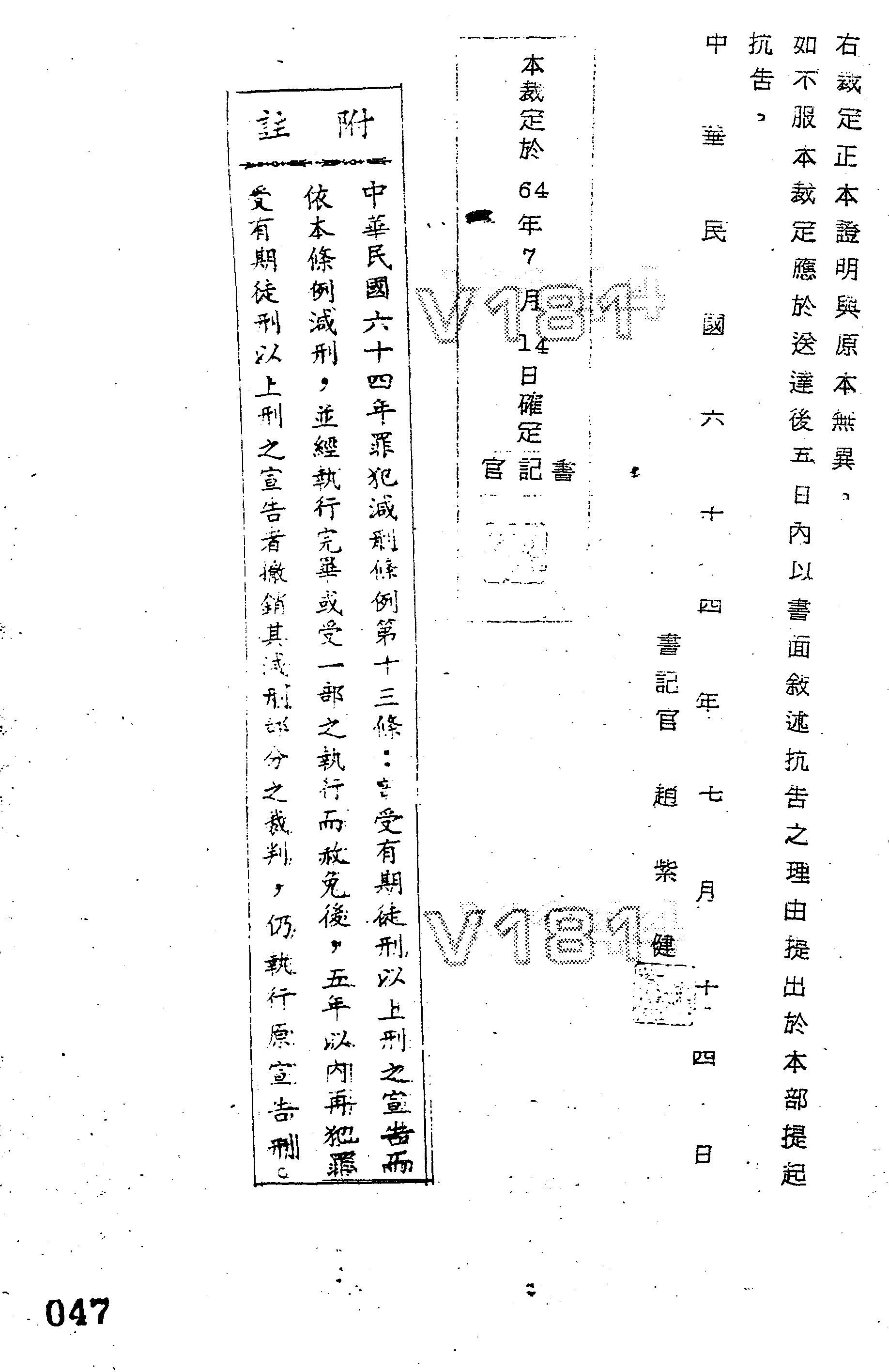 臺灣警備總司令部64年諫減字第0105號裁定書