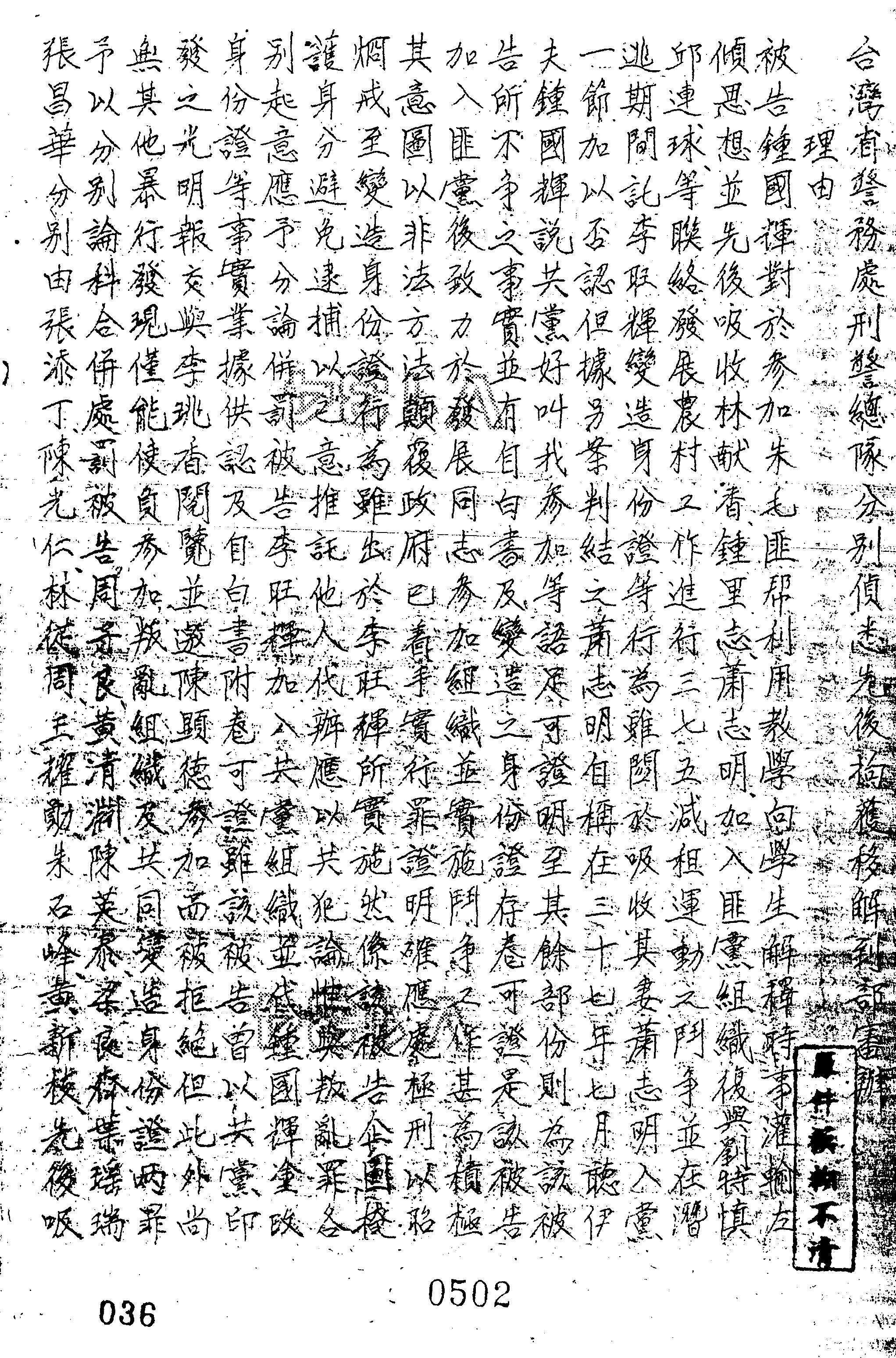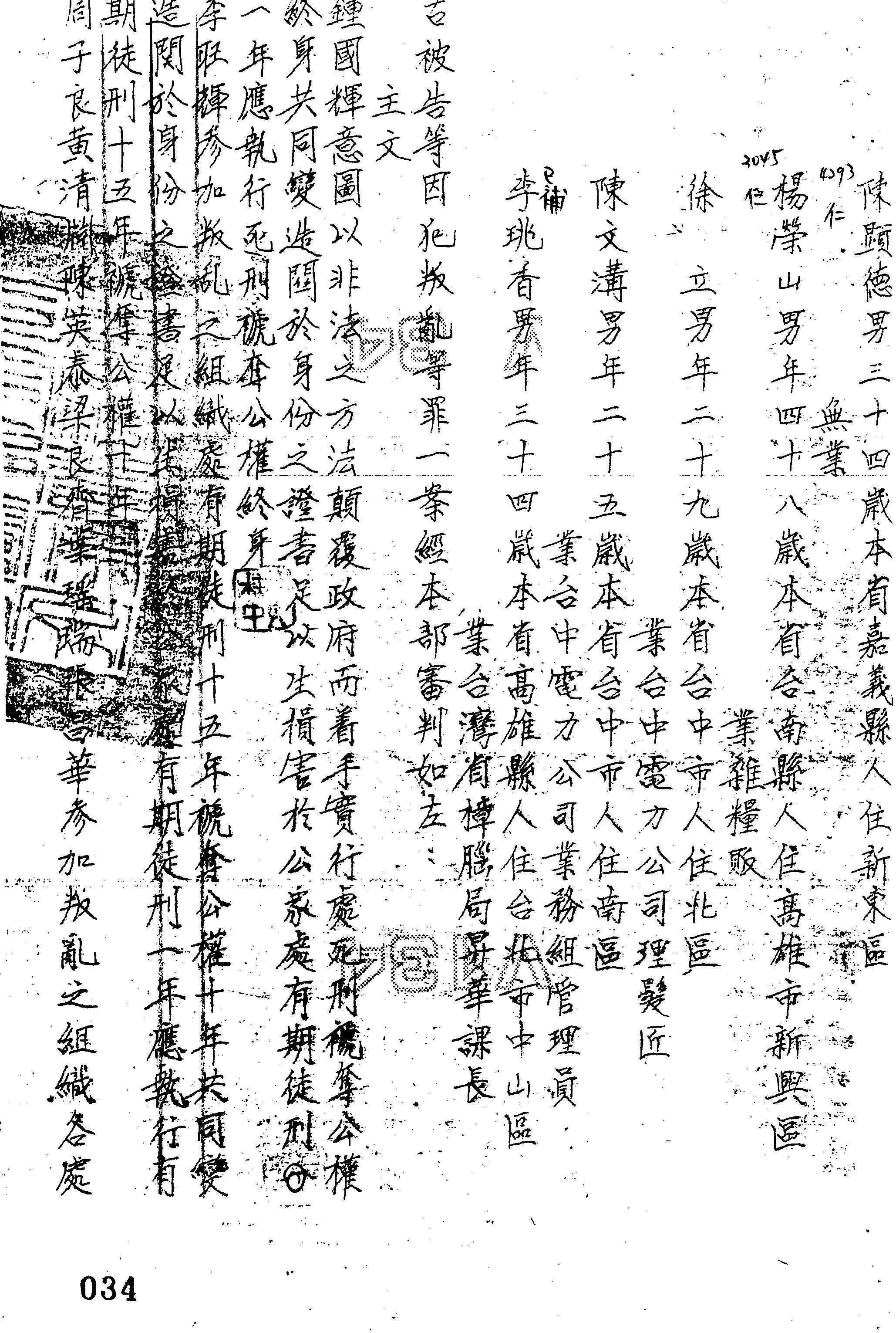 - 法條:修正懲治叛亂條例第10條、第2條第1項、第5條、第8條第1項、第12條;戡亂時期檢肅匪諜條例第8條第1項第2款、第9條;刑法第100條第1項、第212條、第28條、第37條第1項、第37條第2項、第51條第3款、第51條第5款、第51條第10款;刑事訴訟法第291條前段
