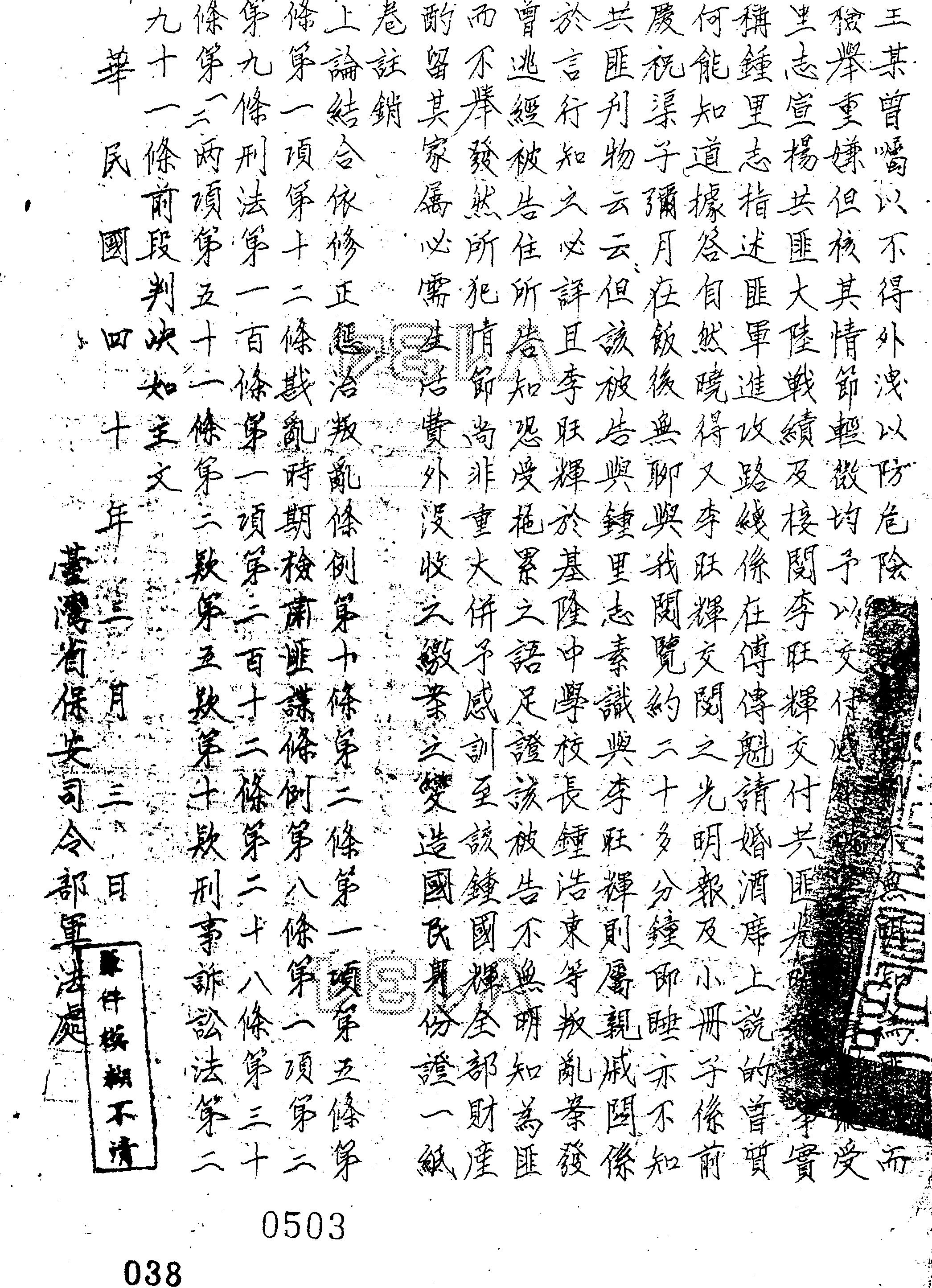 - 裁判書正題名: 臺灣省保安司令部40年安潔字第0978號判決書