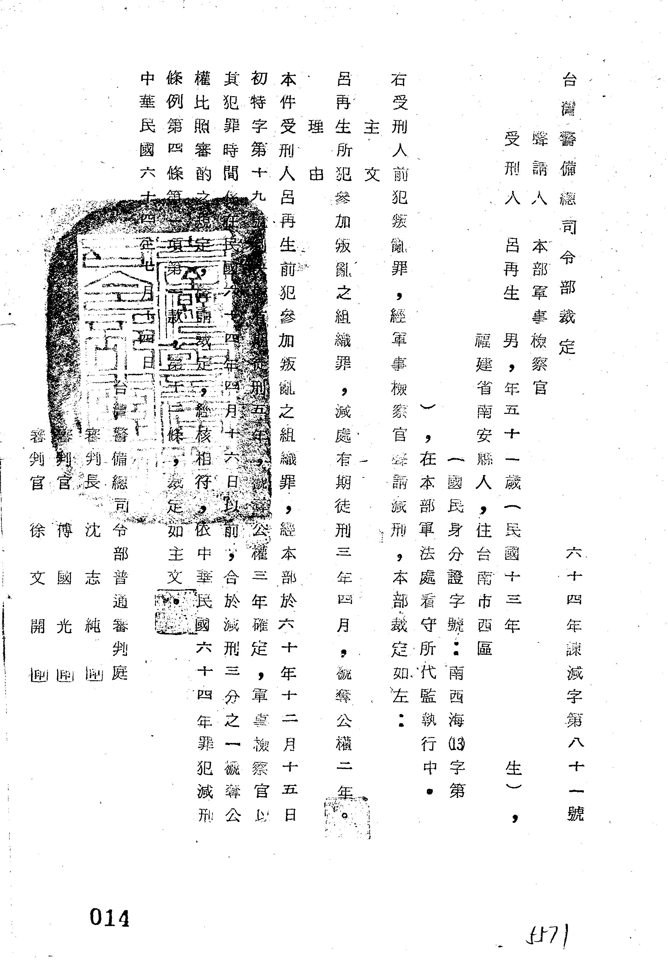 裁判書主文/要旨:呂再生所犯「參加叛亂之組織罪」,減處有期徒刑3年4月,褫奪公權2年。