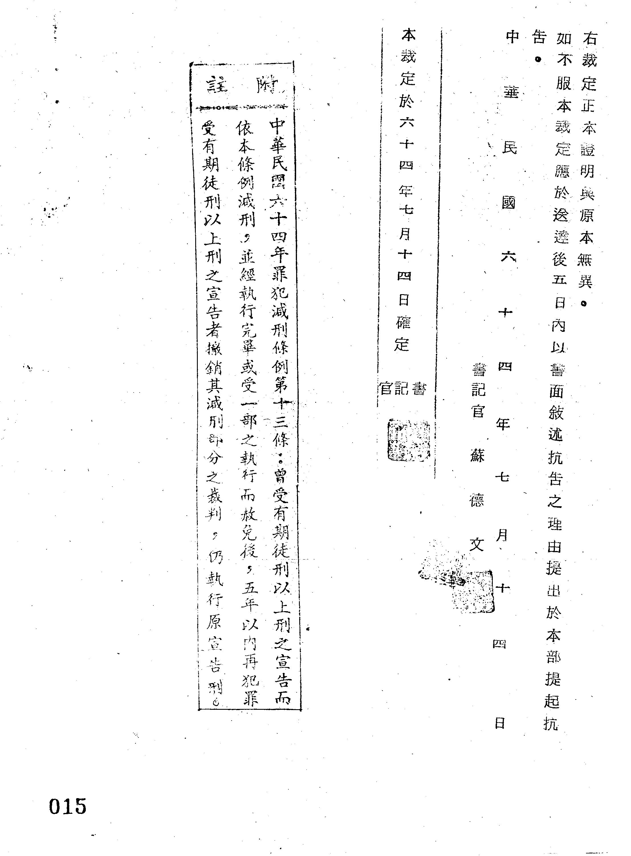 臺灣警備總司令部64年諫減字第0081號裁定書