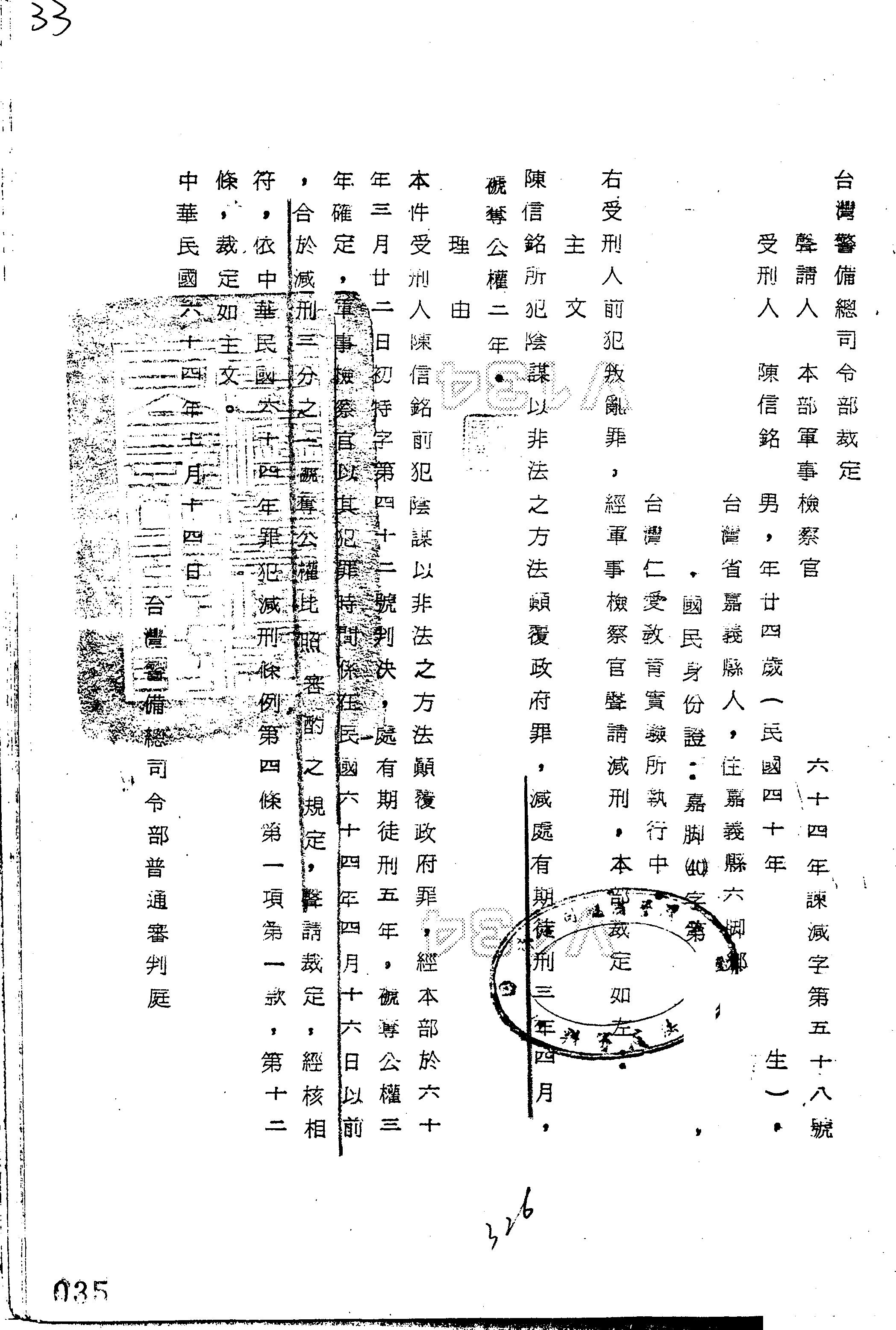 裁判書主文/要旨:陳信銘所犯「陰謀以非法之方法顛覆政府罪」,處有期徒刑3年4月,褫奪公權2年。