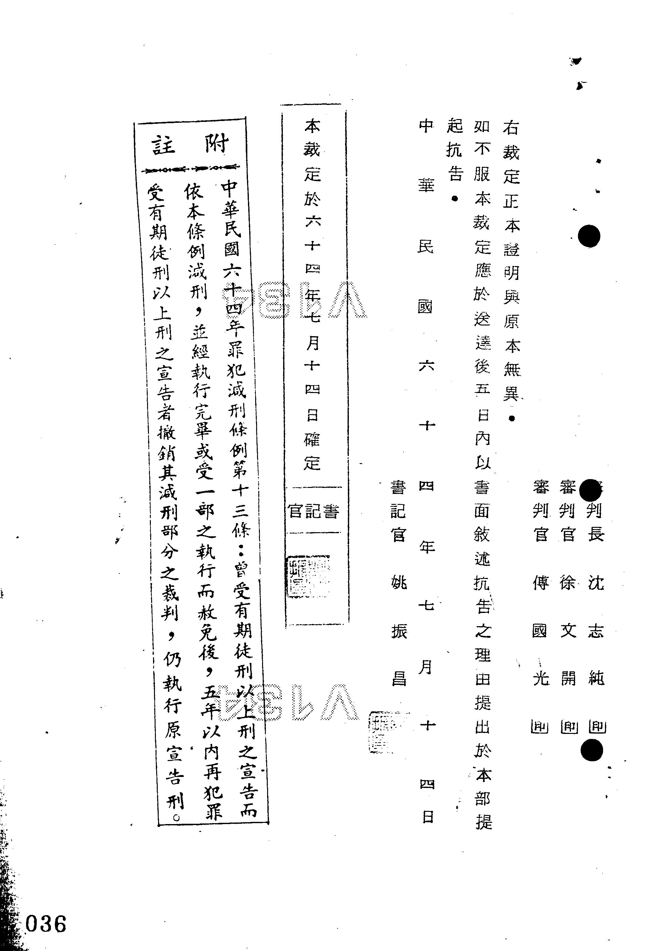 臺灣警備總司令部64年諫減字第0058號裁定書