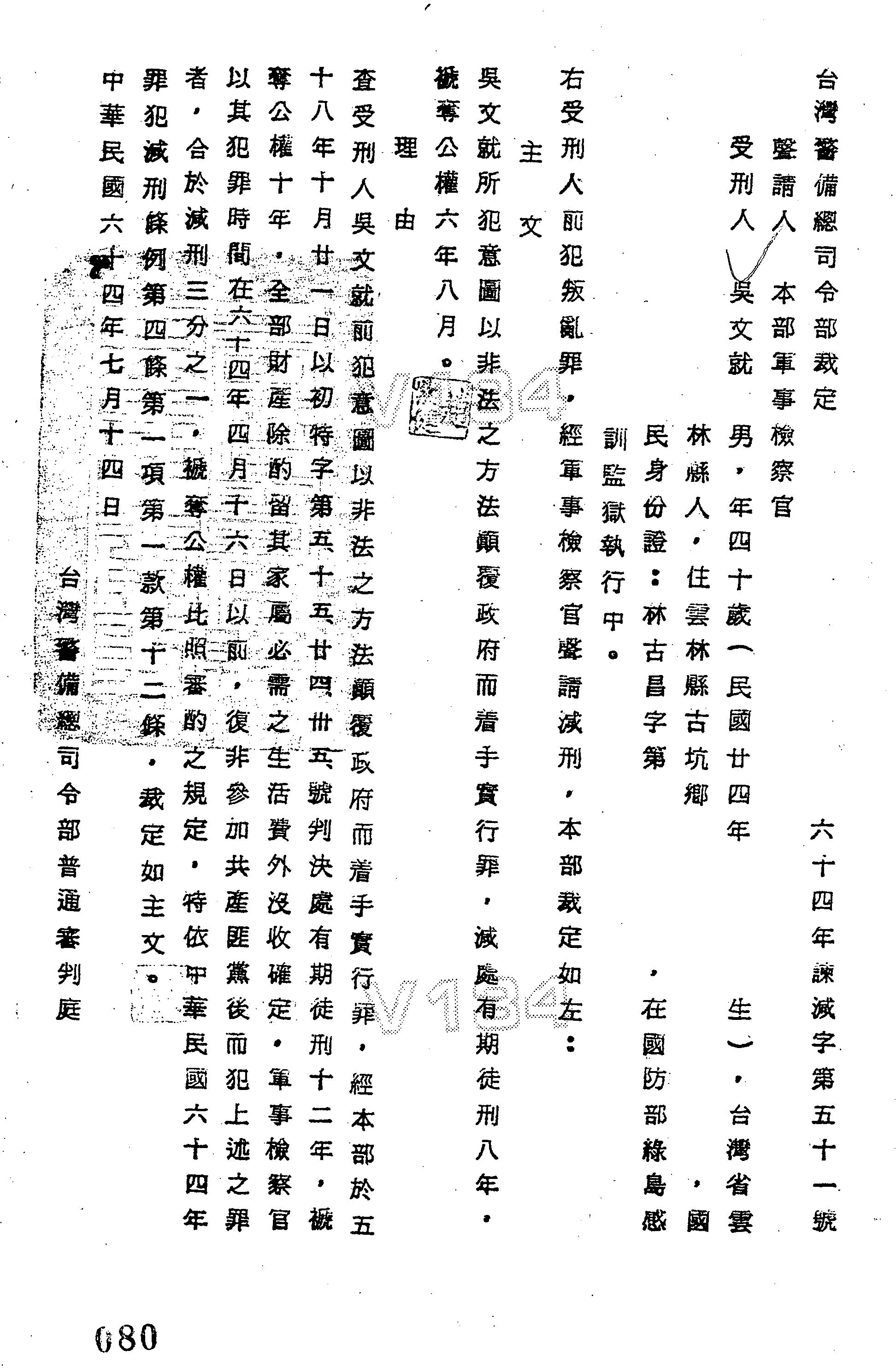 裁判書主文/要旨:吳文就所犯「意圖以非法之方法顛覆政府而著手實行罪」,減處有期徒刑8年,褫奪公權6年8月。