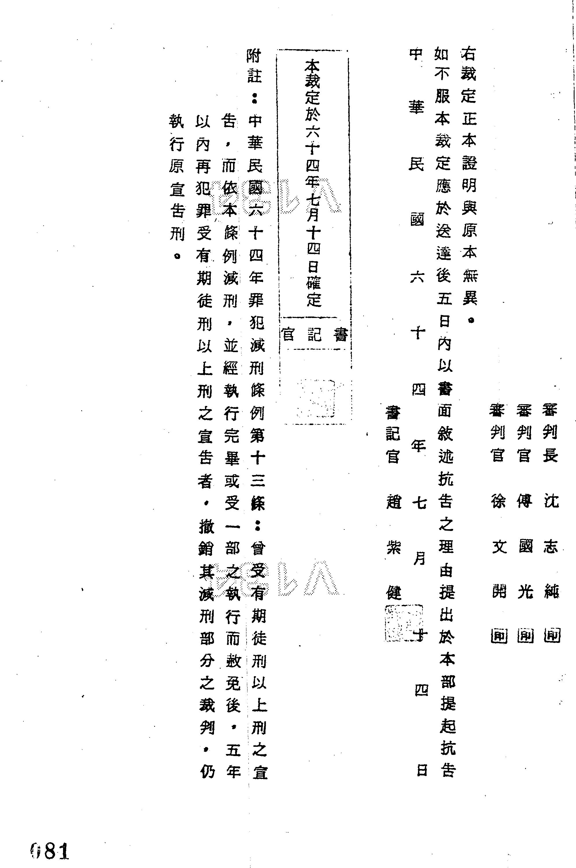 臺灣警備總司令部64年諫減字第0051號裁定書