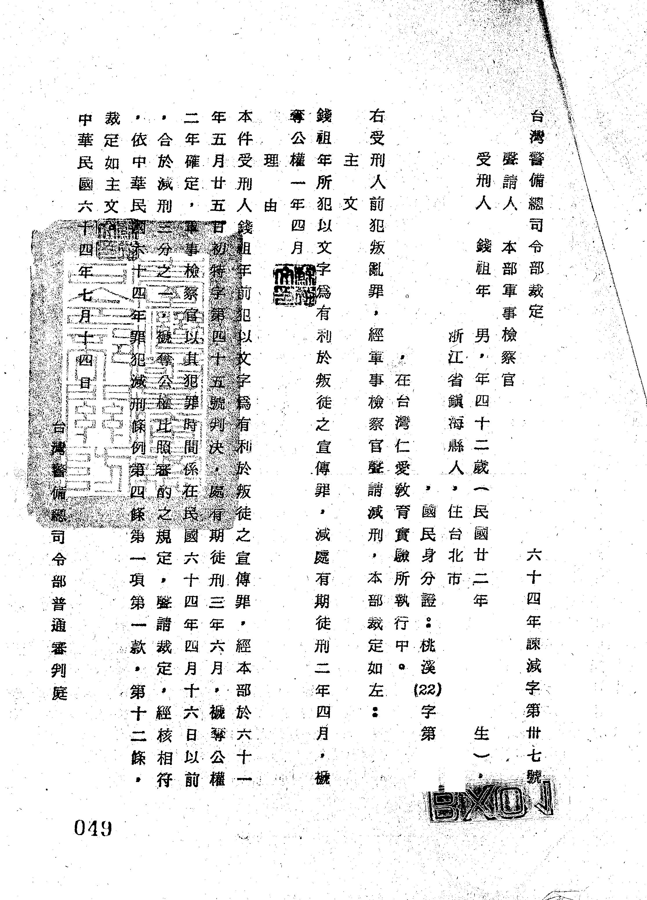 裁判書主文/要旨:錢祖年所犯「以文字為有利於叛徒之宣傳罪」,減處有期徒刑2年4月,褫奪公權1年4月。