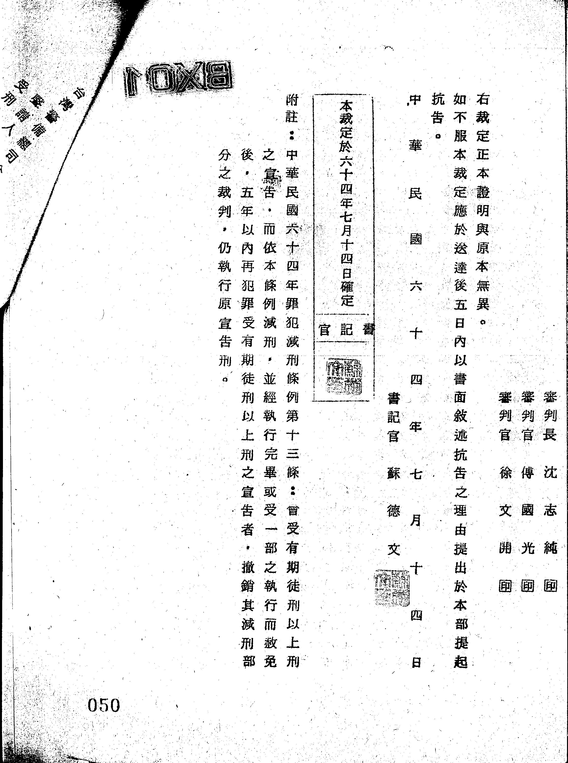 臺灣警備總司令部64年諫減字第0037號裁定書