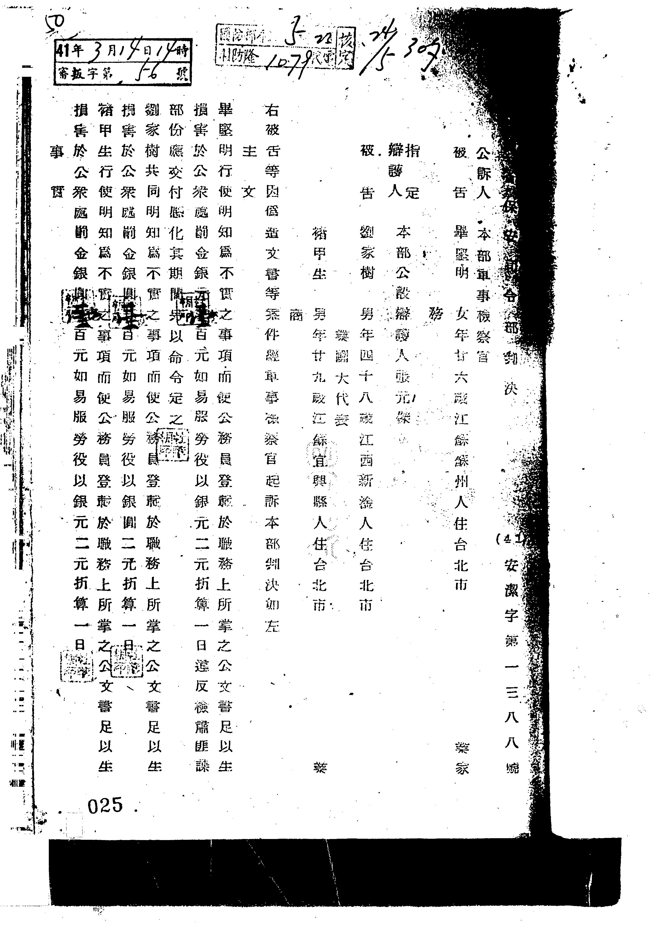 - 裁判書正題名: 臺灣省保安司令部41年安潔字第1388號判決書