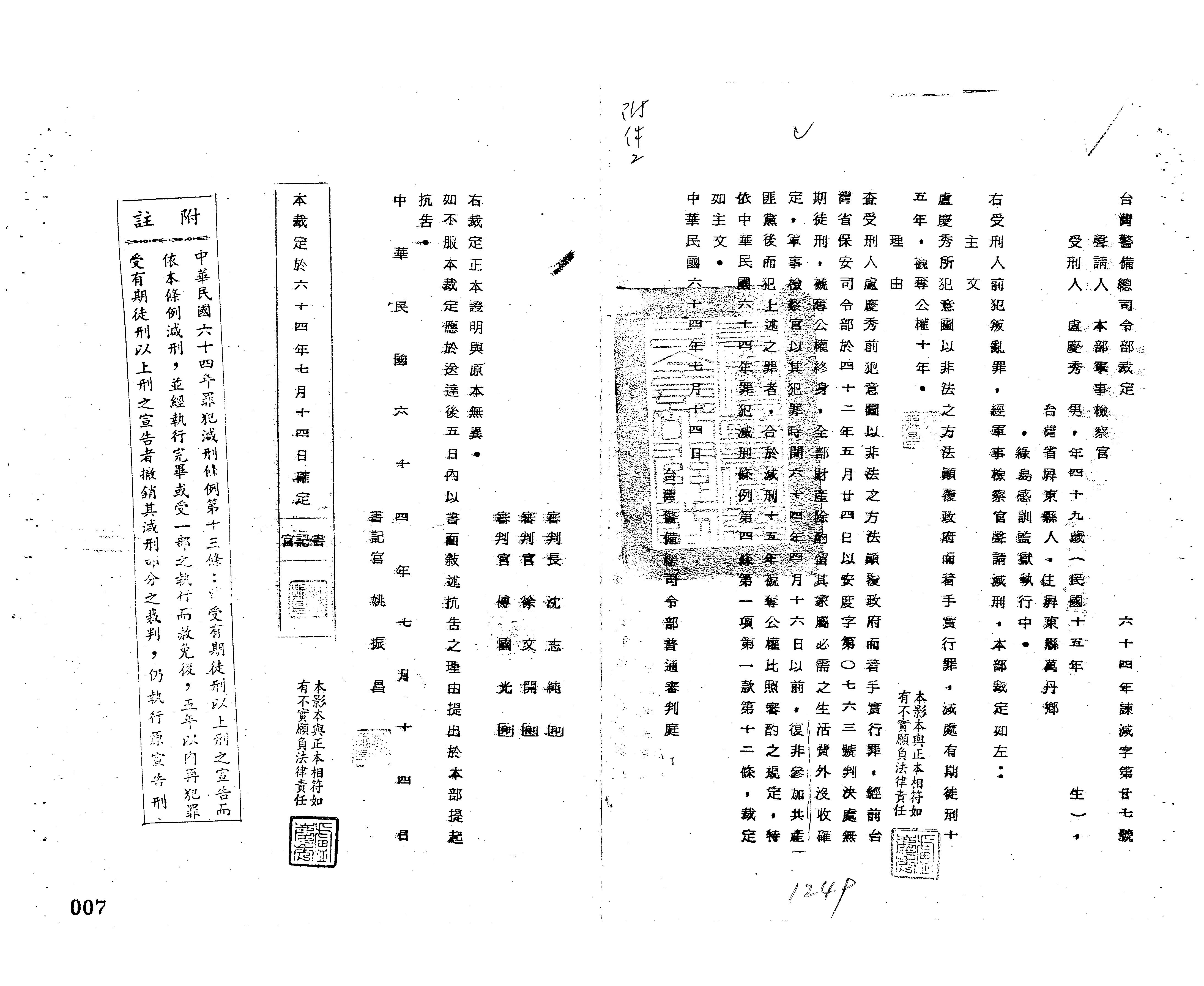 裁判書主文/要旨:盧慶秀所犯「意圖以非法之方法顛覆政府而著手實行罪」,減處有期徒刑15年,褫奪公權10年。