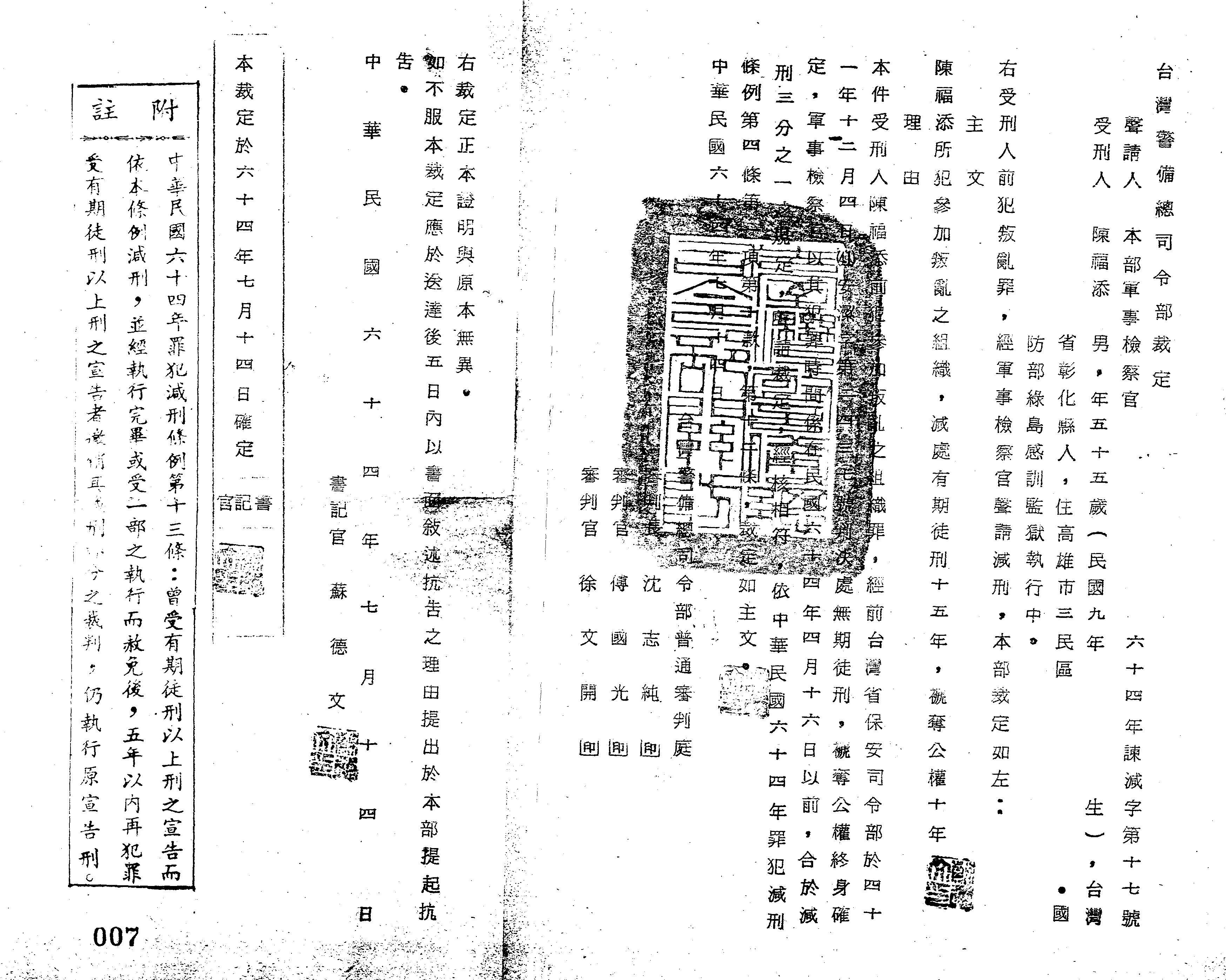 裁判書主文/要旨:陳福添所犯「參加叛亂之組織」,減處有期徒刑15年,褫奪公權10年。
