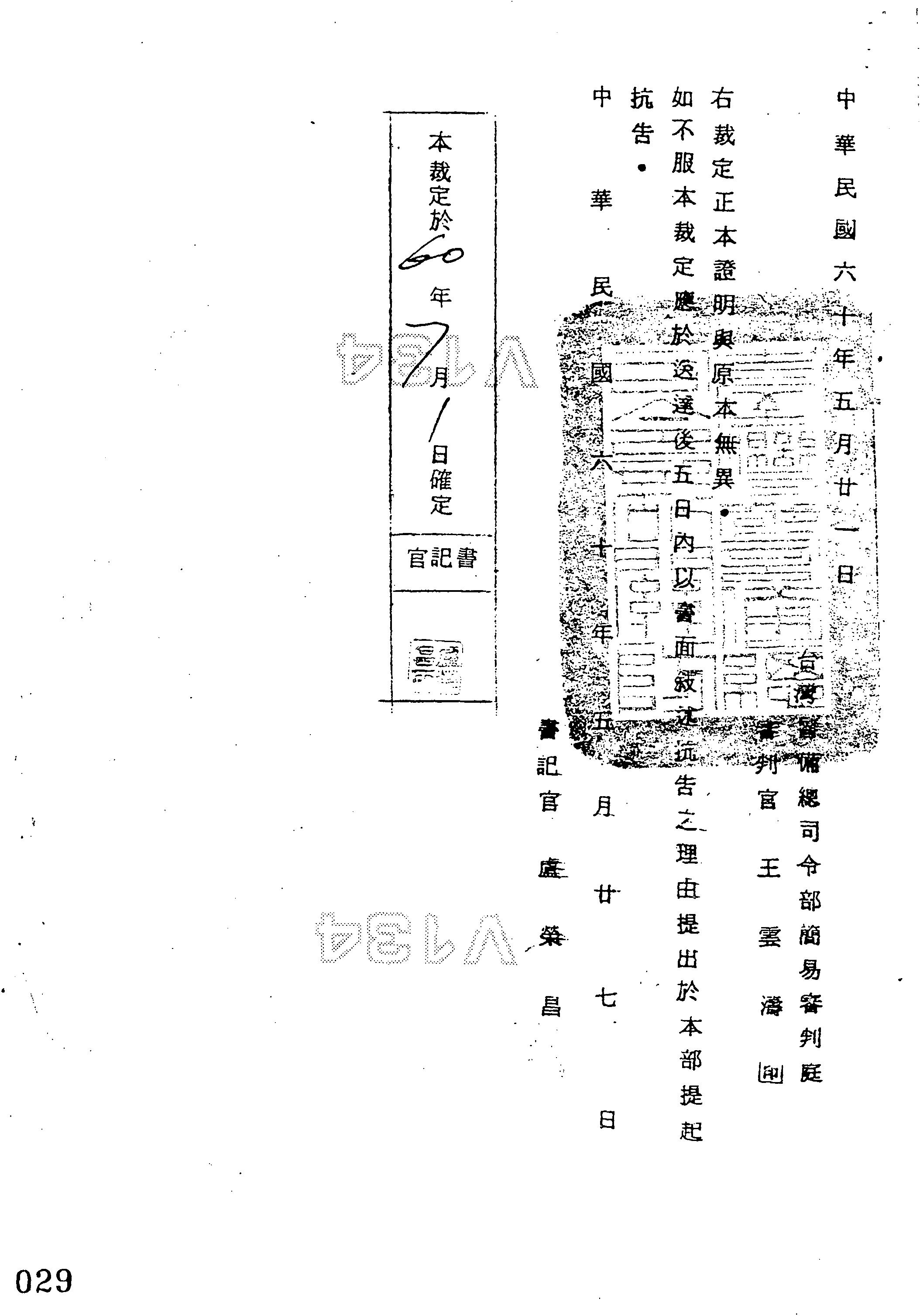 臺灣警備總司令部60年裁化字第0019號/60年遵威字第3343號裁定書