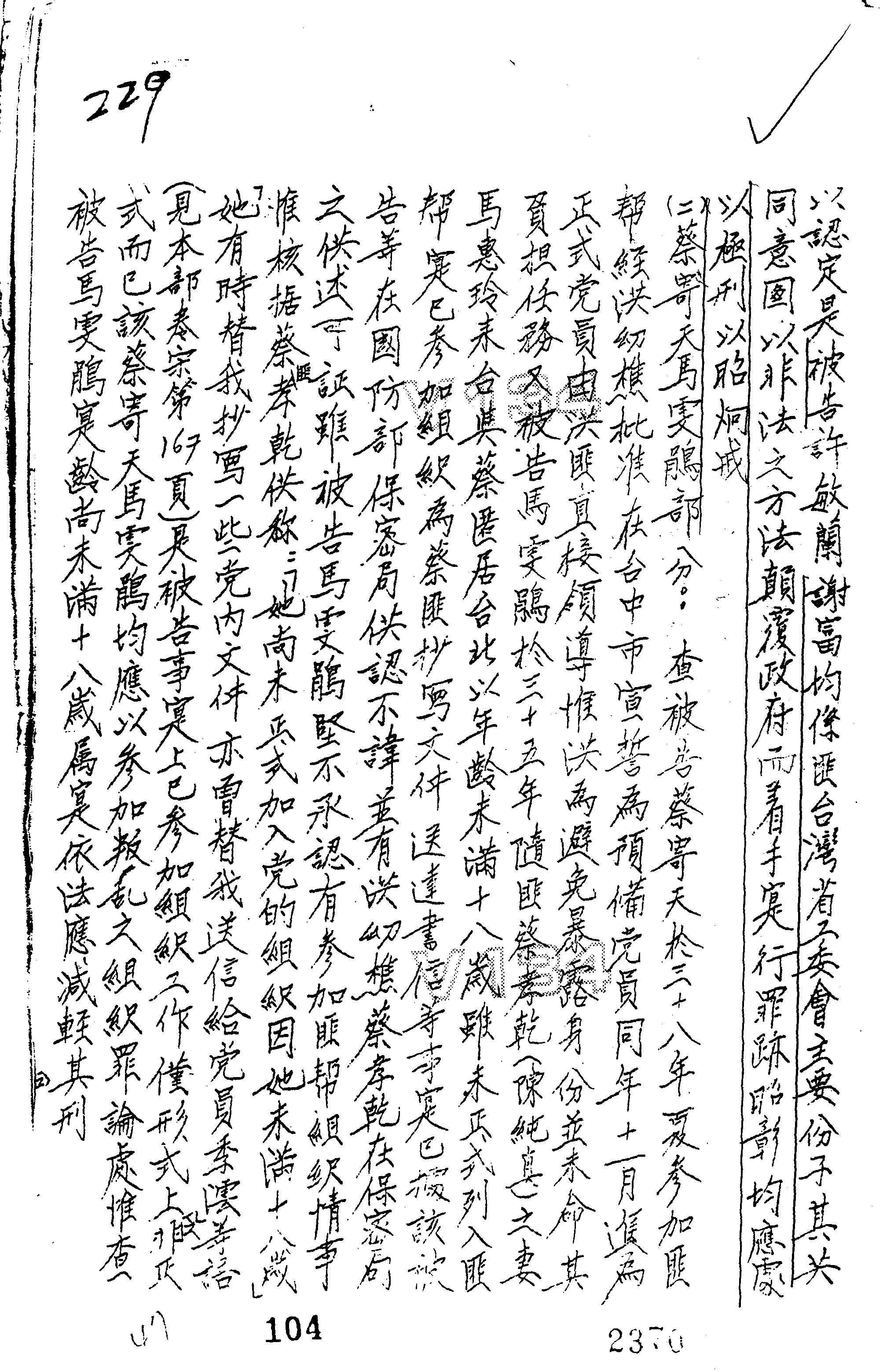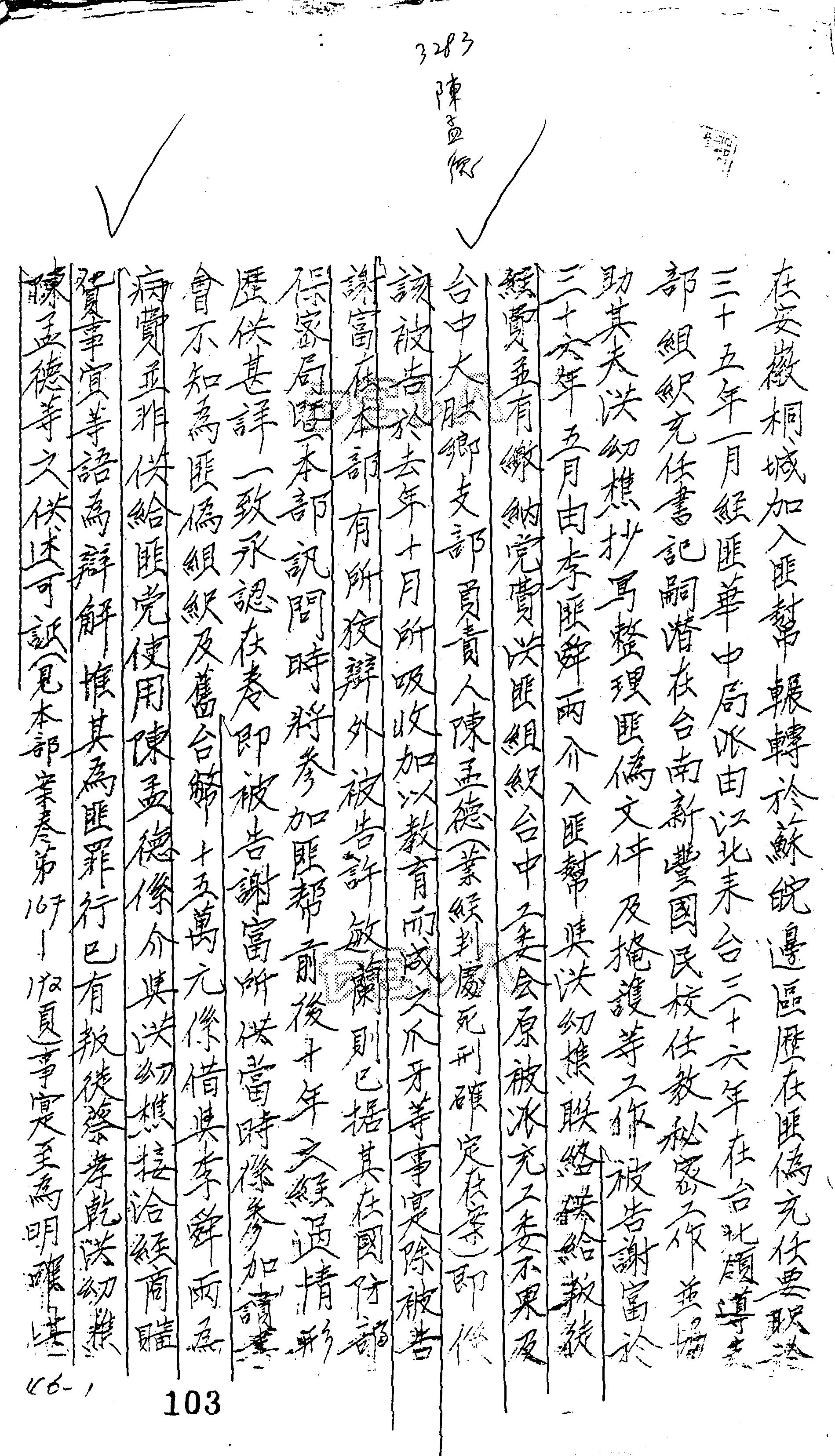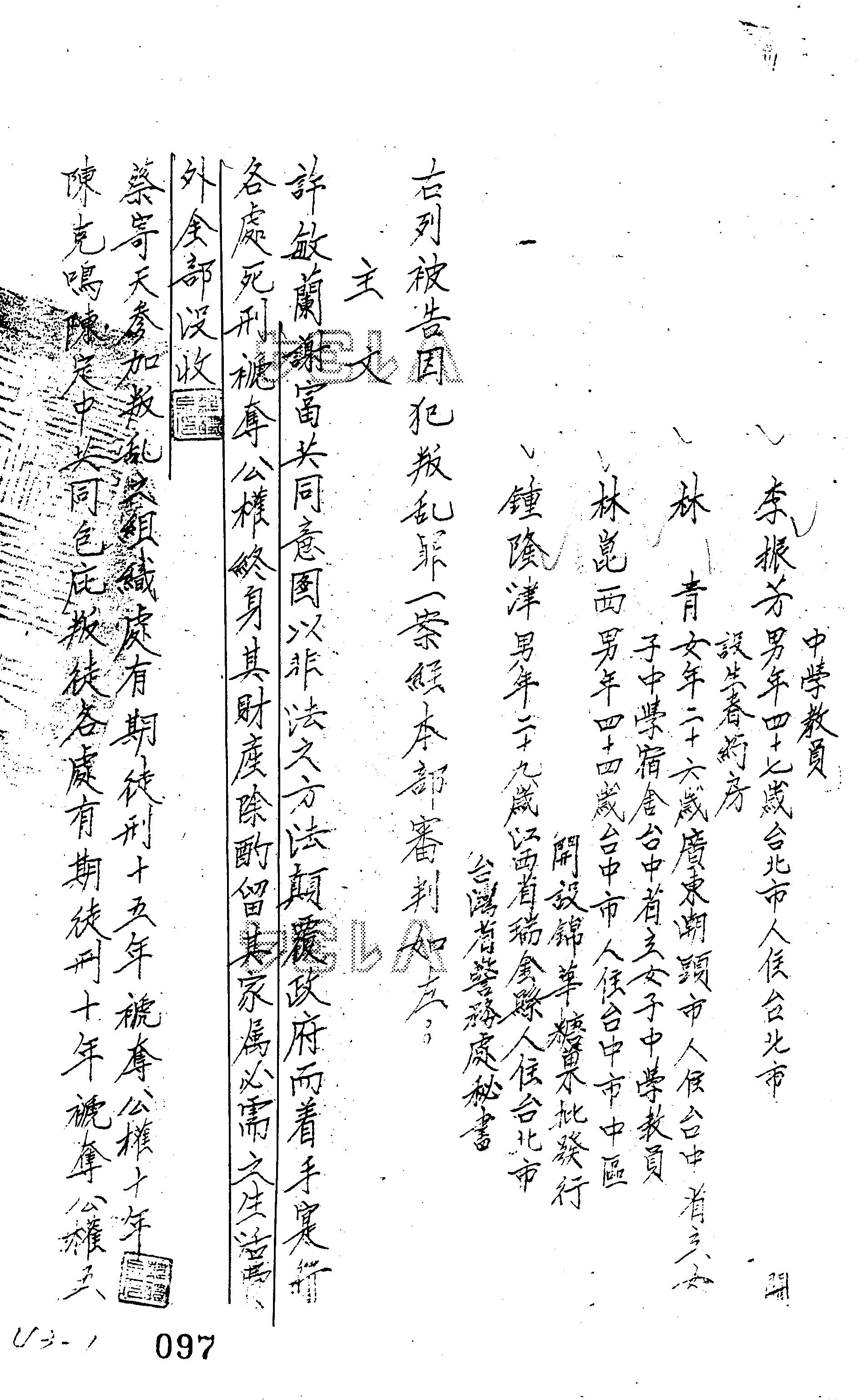 - 法條:修正懲治叛亂條例第2條第1項、第4條第1項第7款、第5條、第8條、第10條;戡亂時期檢肅匪諜條例第9條;刑法第100條第1項、第214條、第28條、第37條第1項、第37條第2項、第18條第2項、第65條第2項、第66條前段;修正戒嚴法第8條第1項第5款;刑事訴訟法第291條前段、第293條第1項