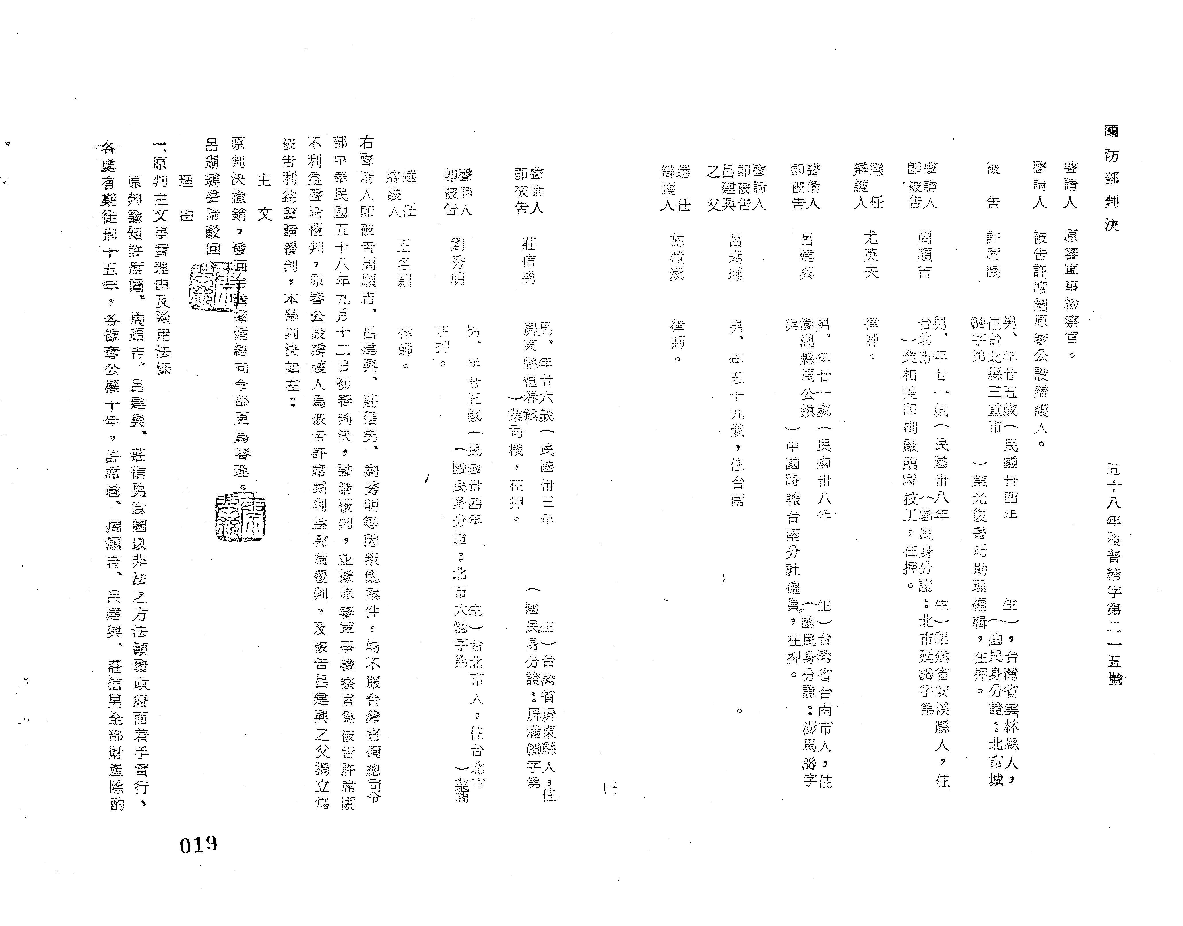 裁判書主文/要旨:原判決撤銷,發回臺灣警備總司令部更為審理。呂瑚璉聲請駁回。