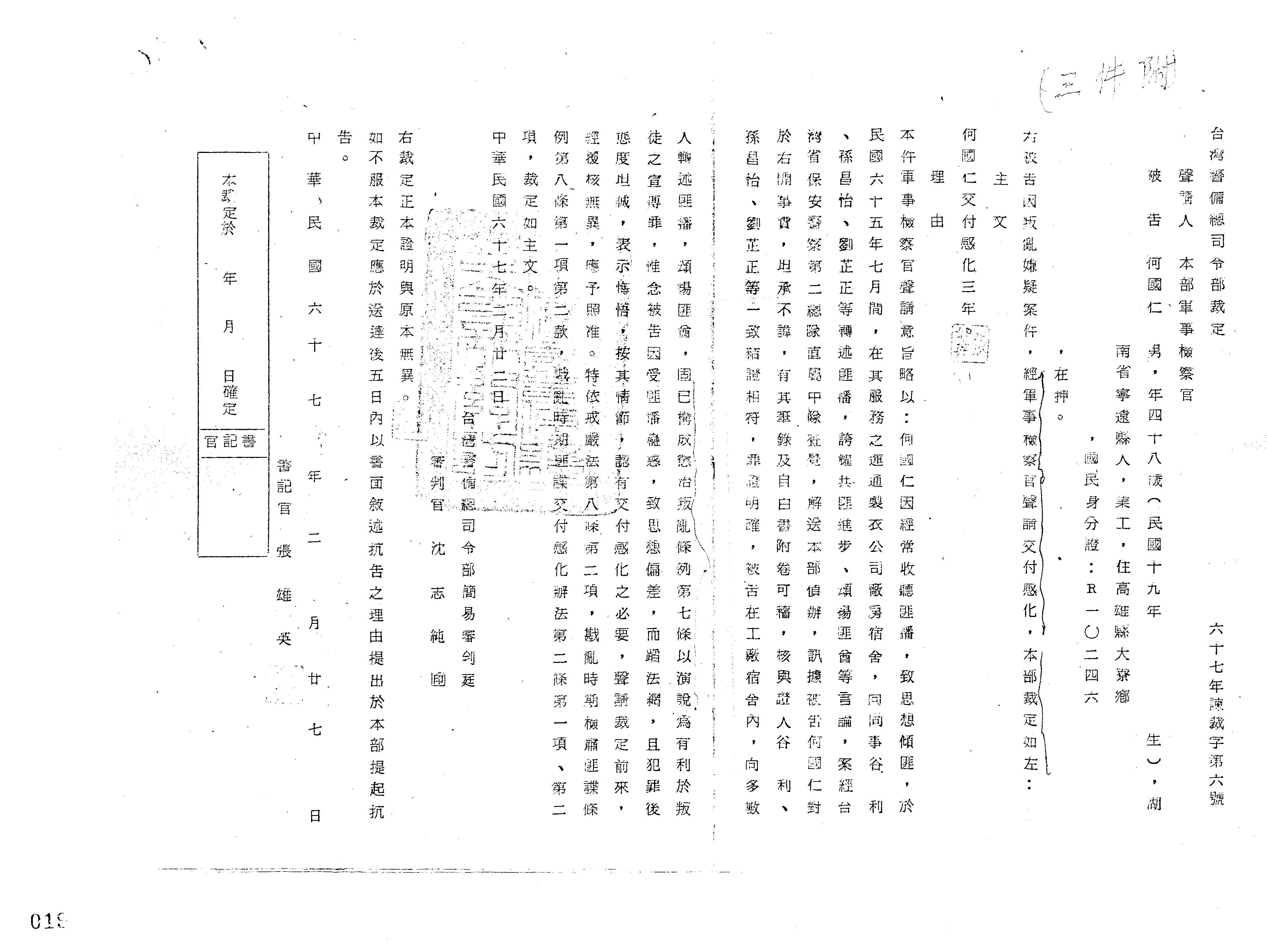 臺灣警備總司令部67年諫裁字第0006號裁定書