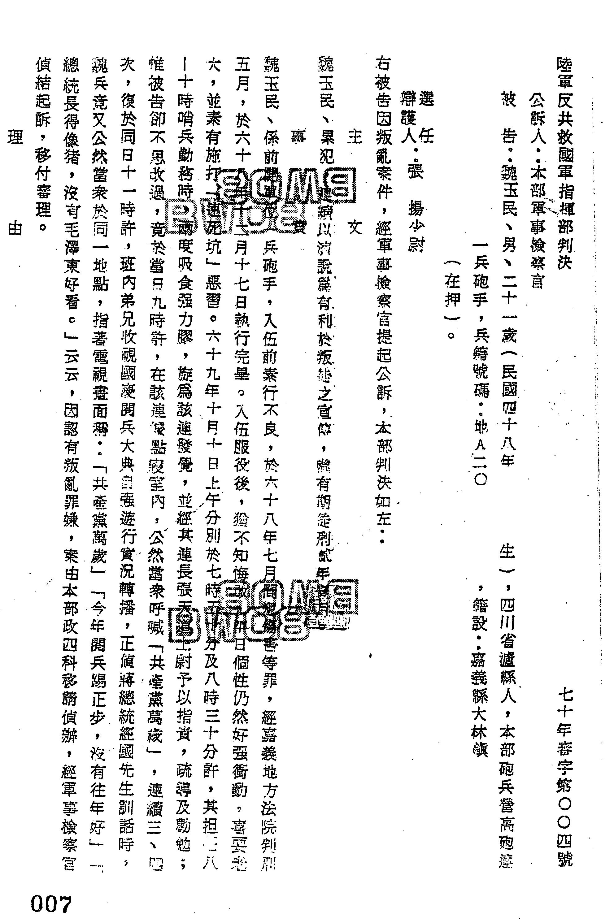 陸軍反共救國軍指揮部70年審字第0004號判決書