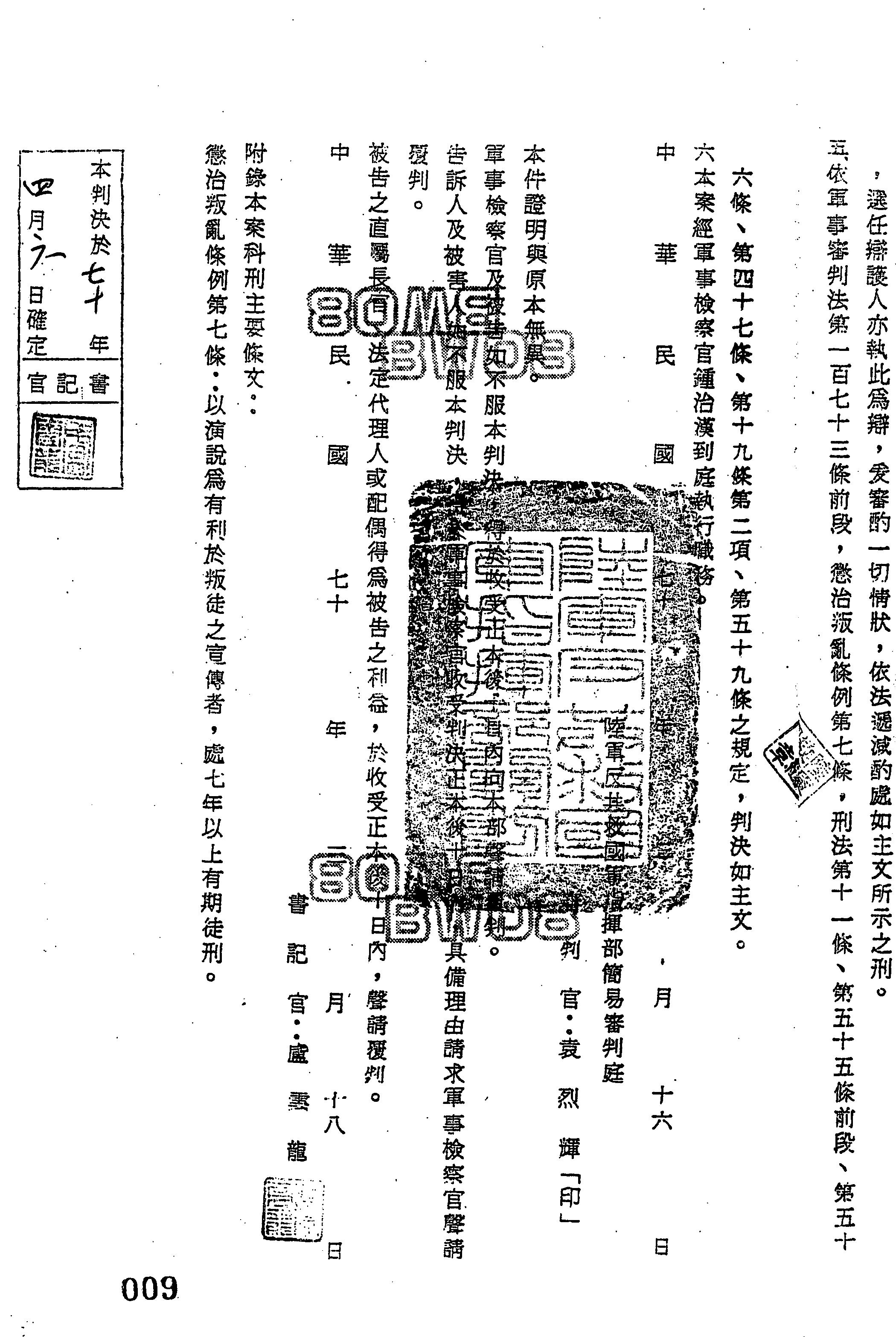 法條:軍事審判法第173條前段;懲治叛亂條例第7條;刑法第11條、第55條前段、第56條、第47條、第19條第2項、第59條