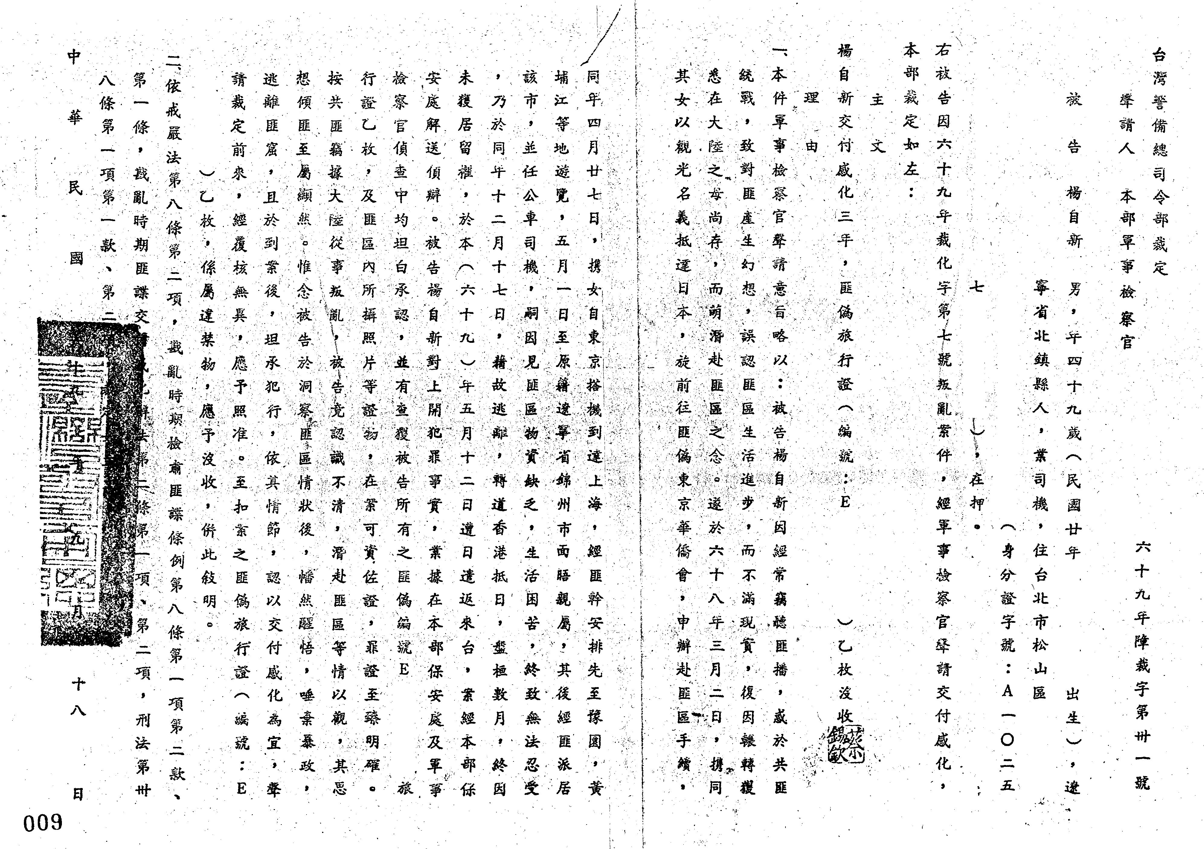 裁判書主文/要旨:楊自新交付感化3年,匪偽旅行證(編號:E八十五號)1枚沒收。