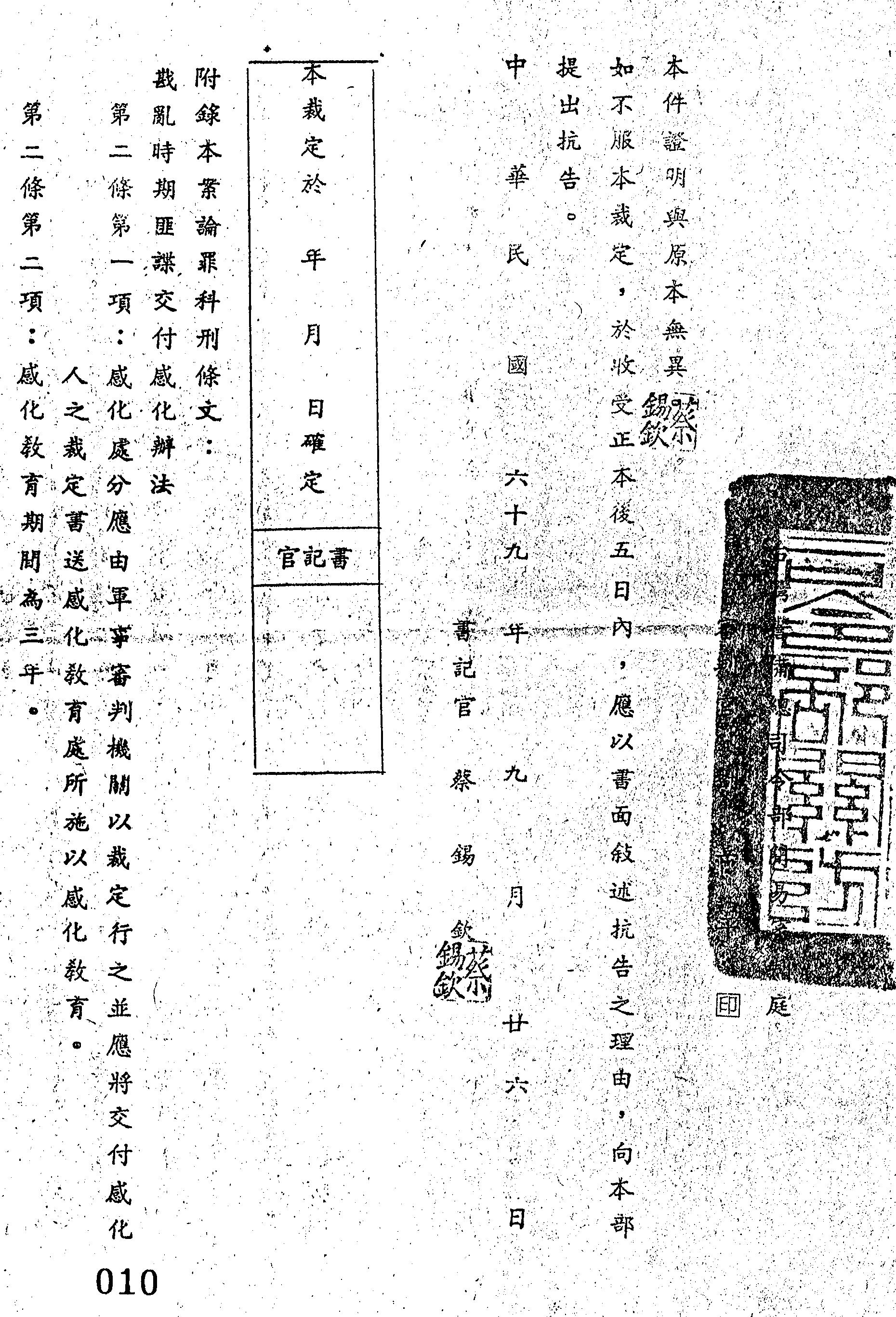 臺灣警備總司令部69年障裁字第0031號裁定書