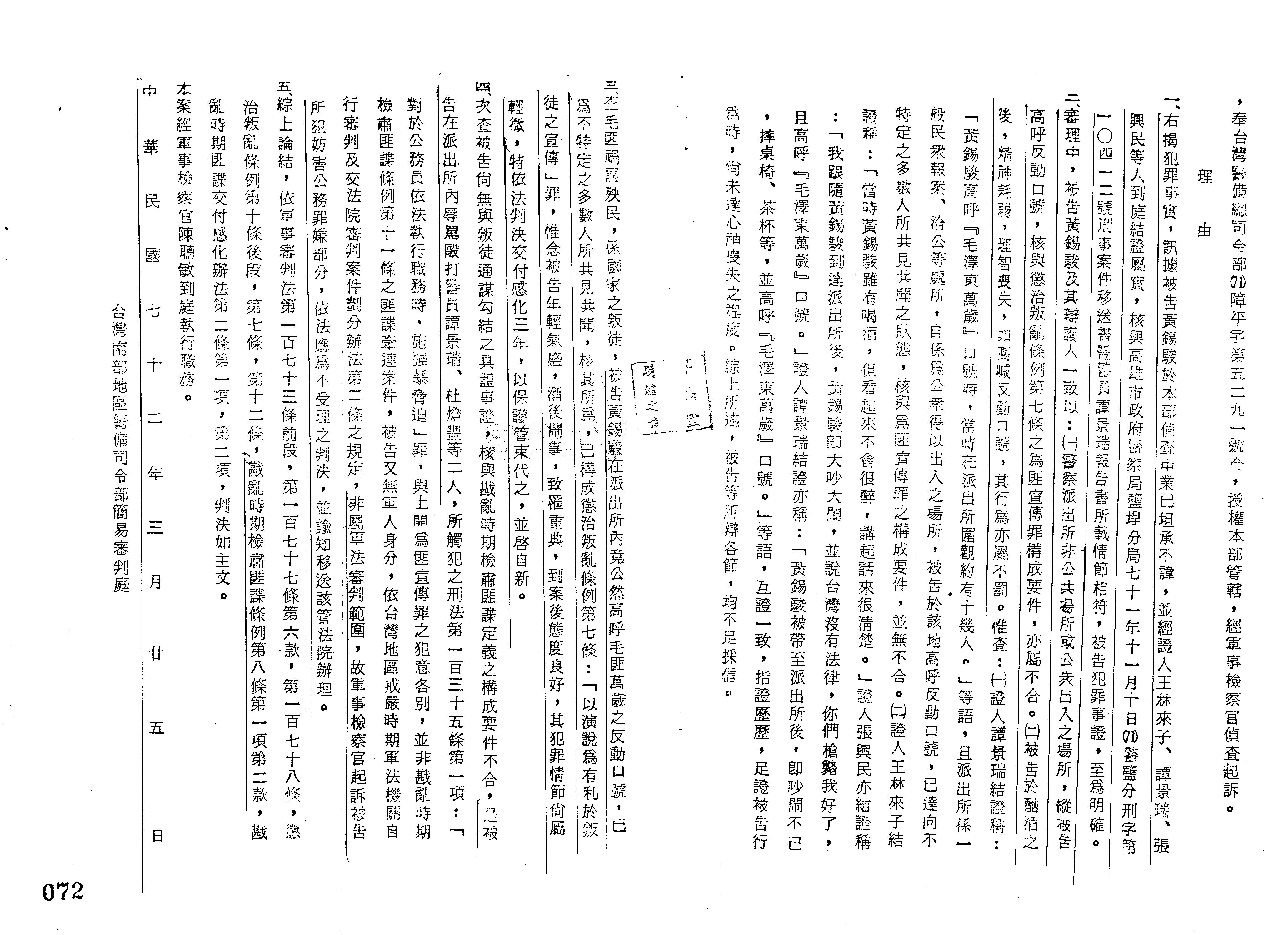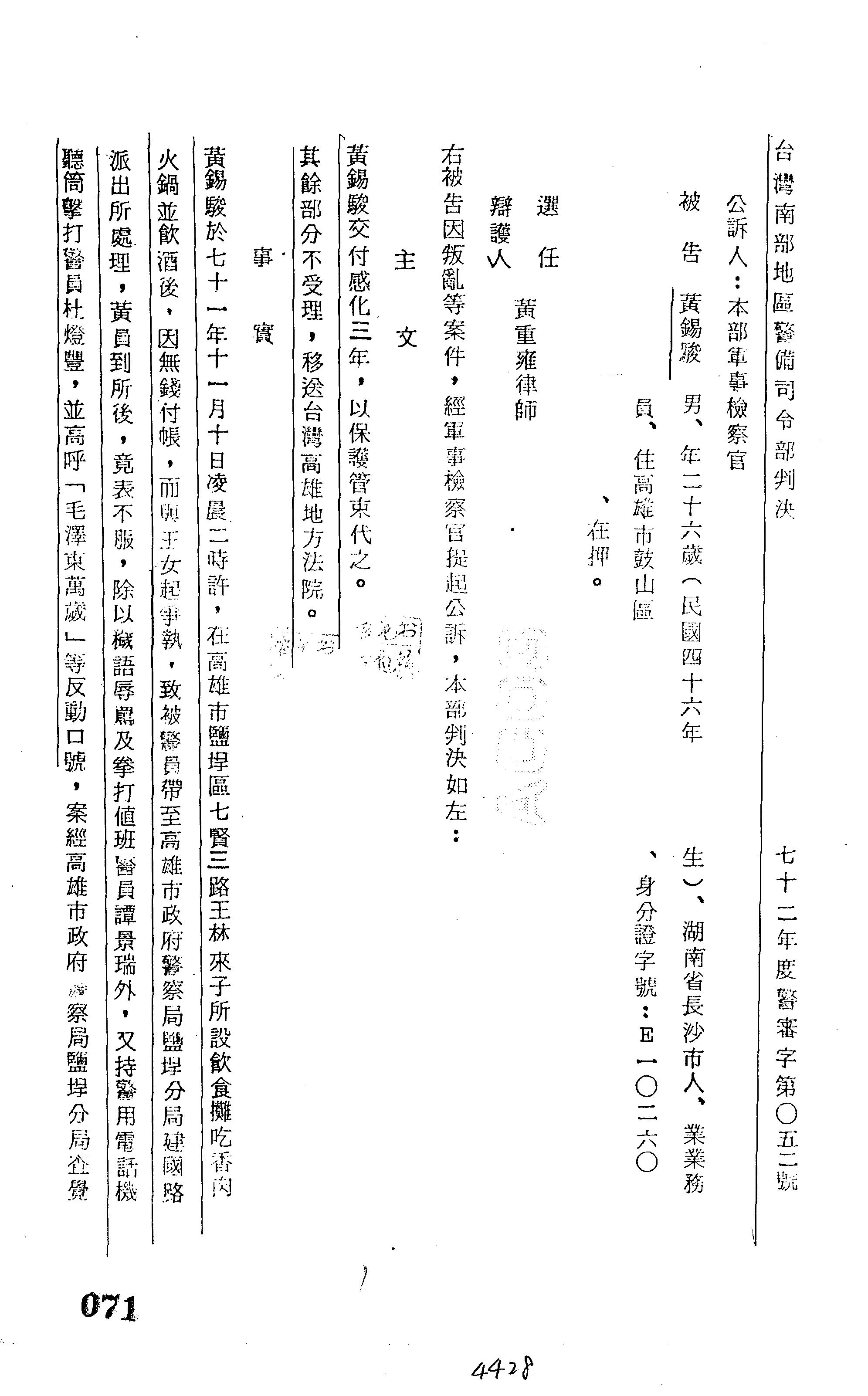 臺灣南部地區警備司令部72年警審字第0052號判決書