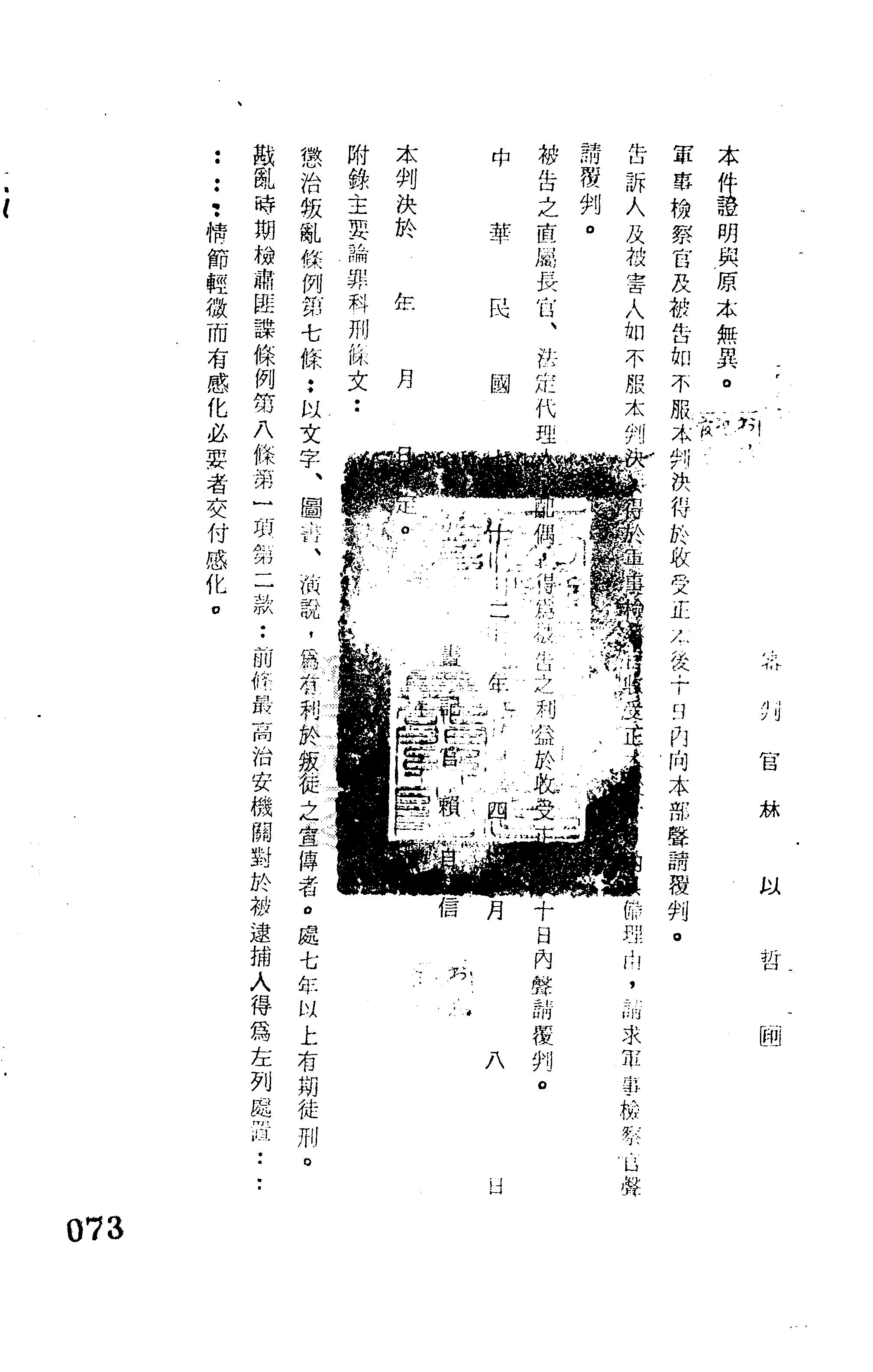 法條:軍事審判法第173條前段、第177條第6款、第178條;懲治叛亂條例第10條後段、第7條、第12條;戡亂時期檢肅匪諜條例第8條第1項第2款;戡亂時期匪諜交付感化辦法第2條第1項、第2條第2項