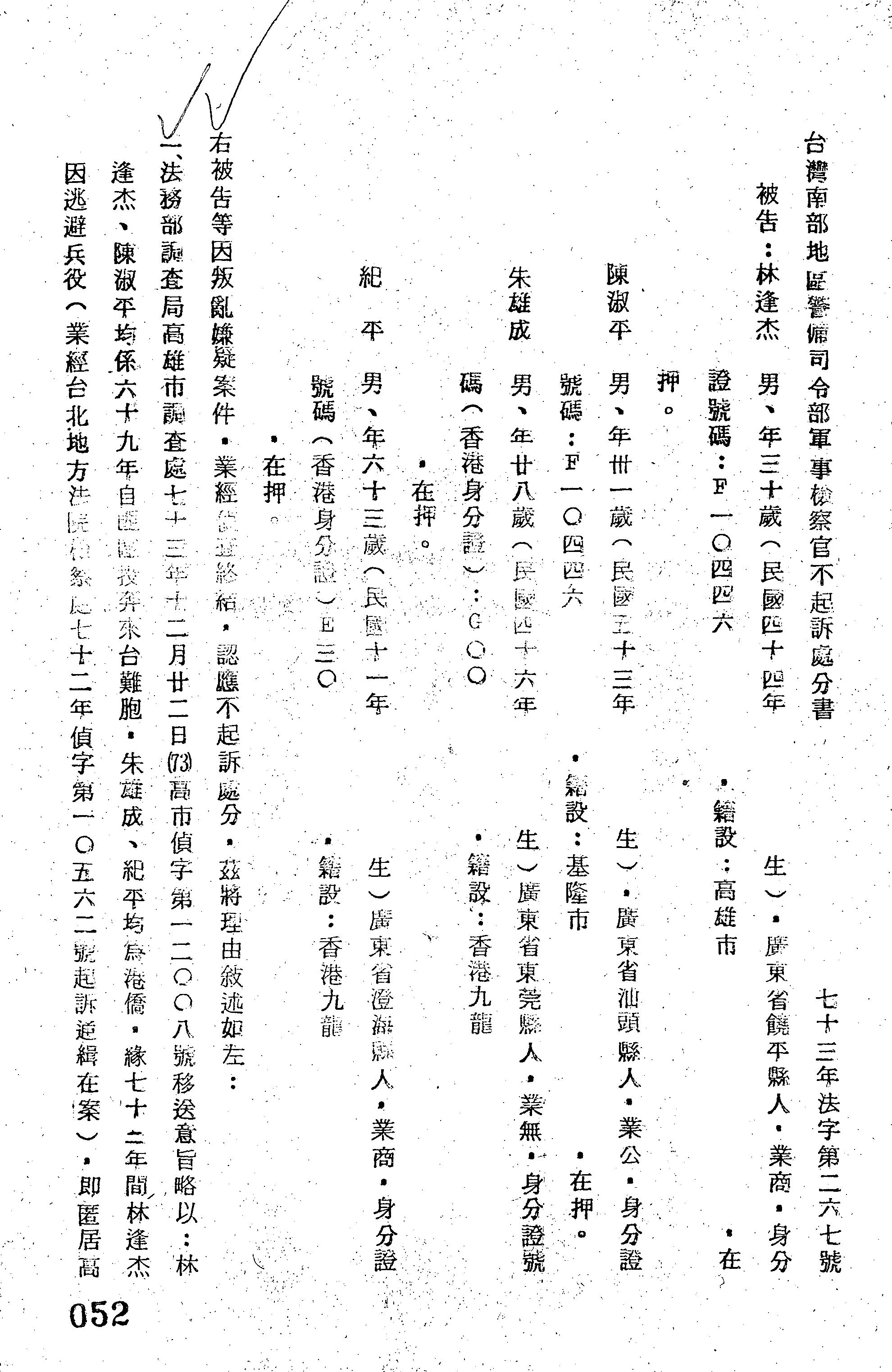 臺灣南部地區警備司令部73年法字第0267號軍事檢察官不起訴處分書